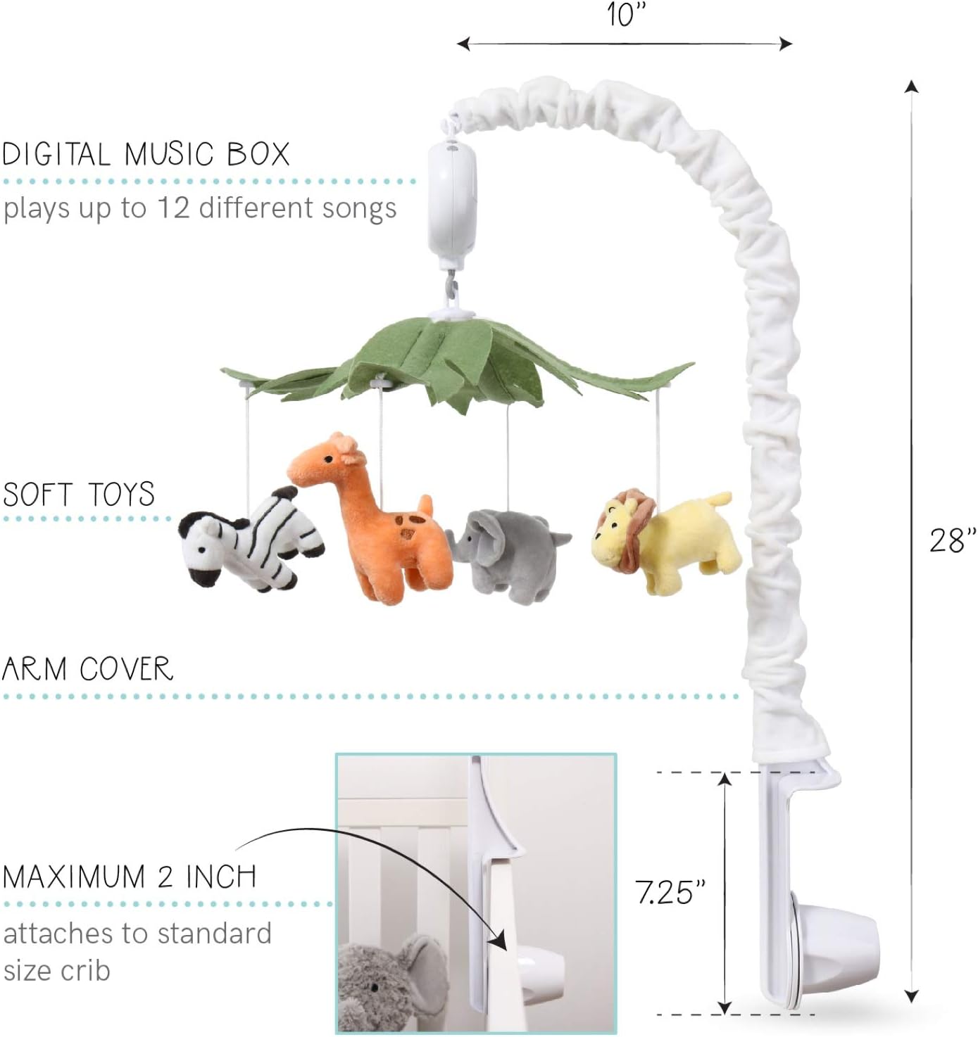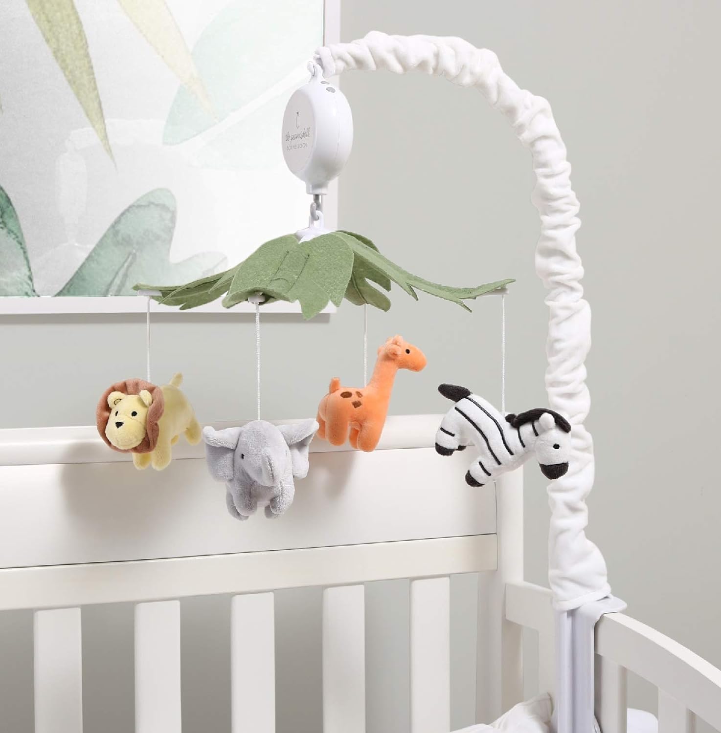 Entretenga a su pequeño con sueños de aventuras en la selva con The Peanut Shell Safari Animals Musical Mobile. Dulce jirafa, cebra juguetona, adorable elefante y un poderoso león en brillantes tonos tropicales cuelgan juguetonamente de un dosel central de hojas gigantes. Las hojas del dosel están hechas de fieltro, y cada personaje está hecho de terciopelo blanco súper suave con detalles bordados. El móvil combina perfectamente con el paquete de 2 sábanas para cuna y juegos de cama de guardería de The Peanutshell Safari