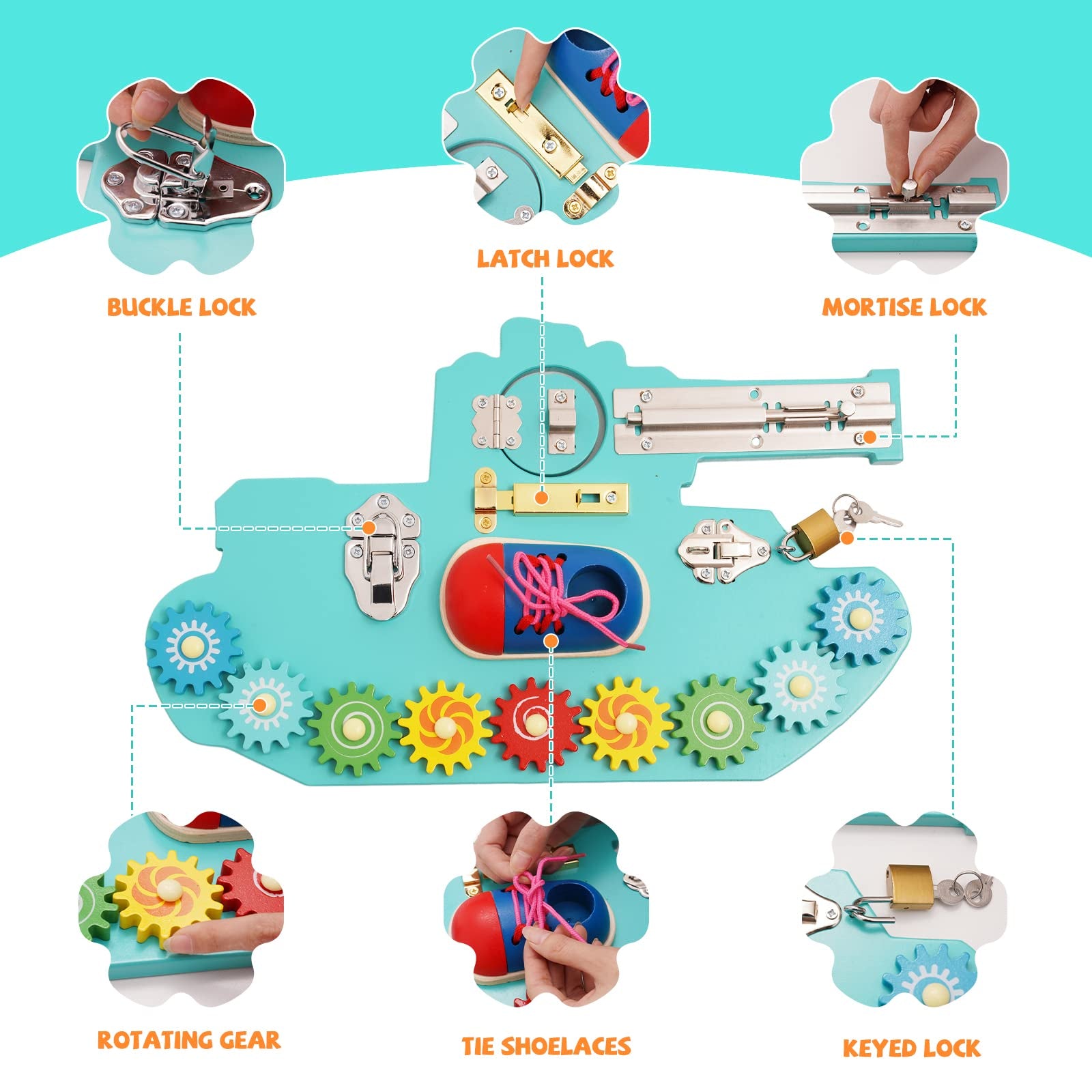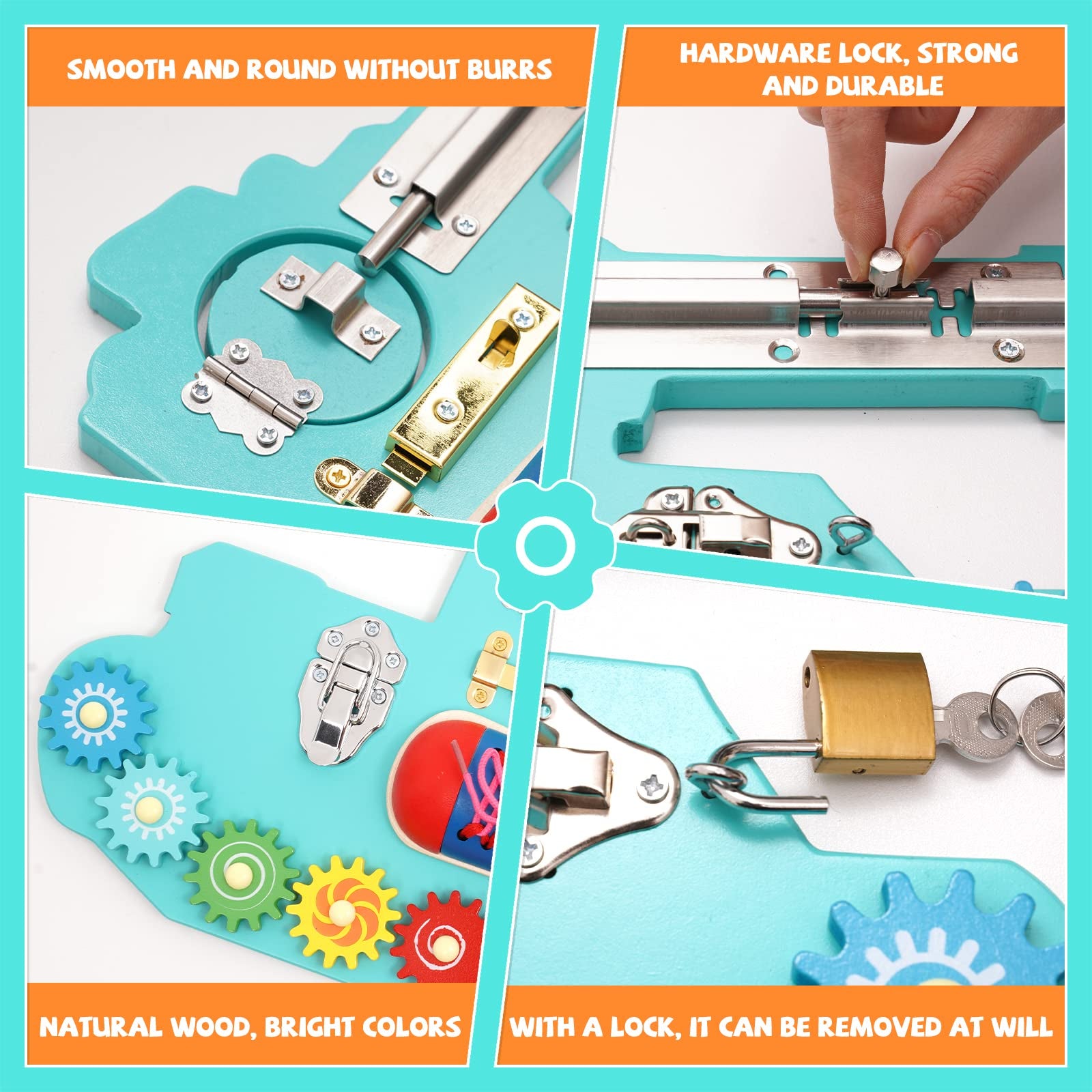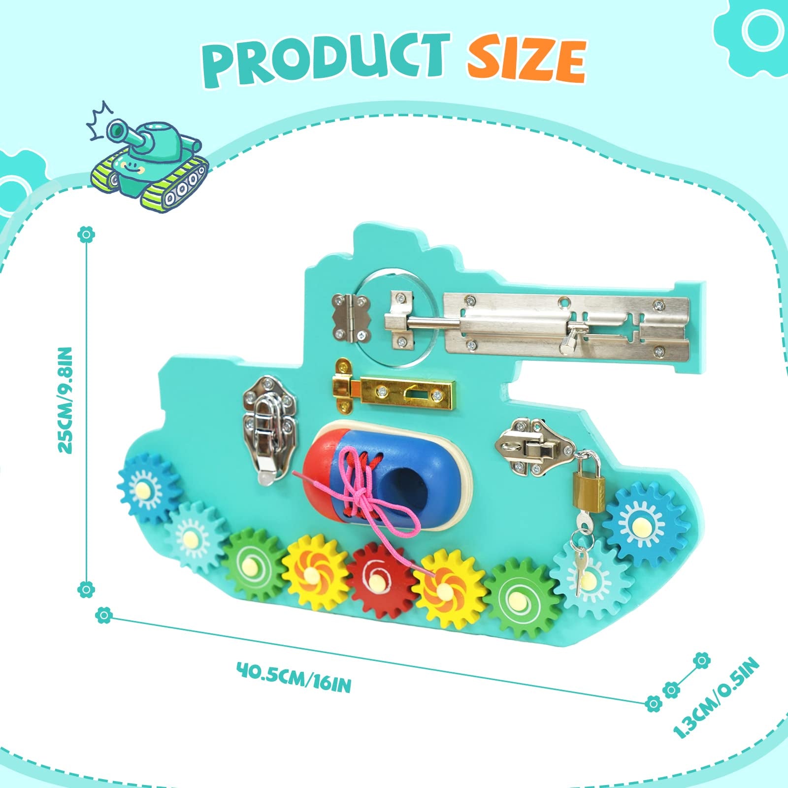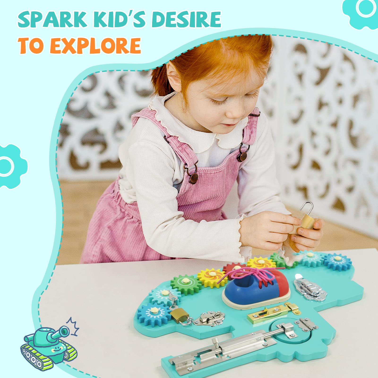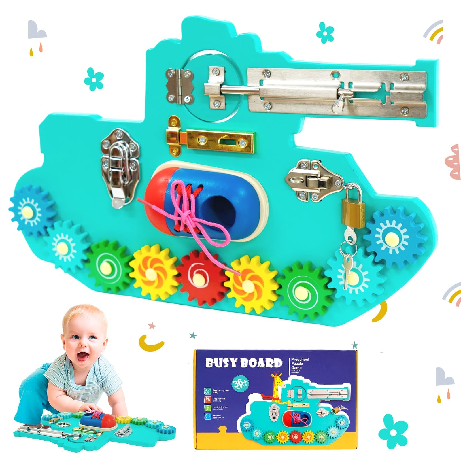 Tablero ocupado para niños pequeños, con cerraduras, pestillos, llaves y engranajes