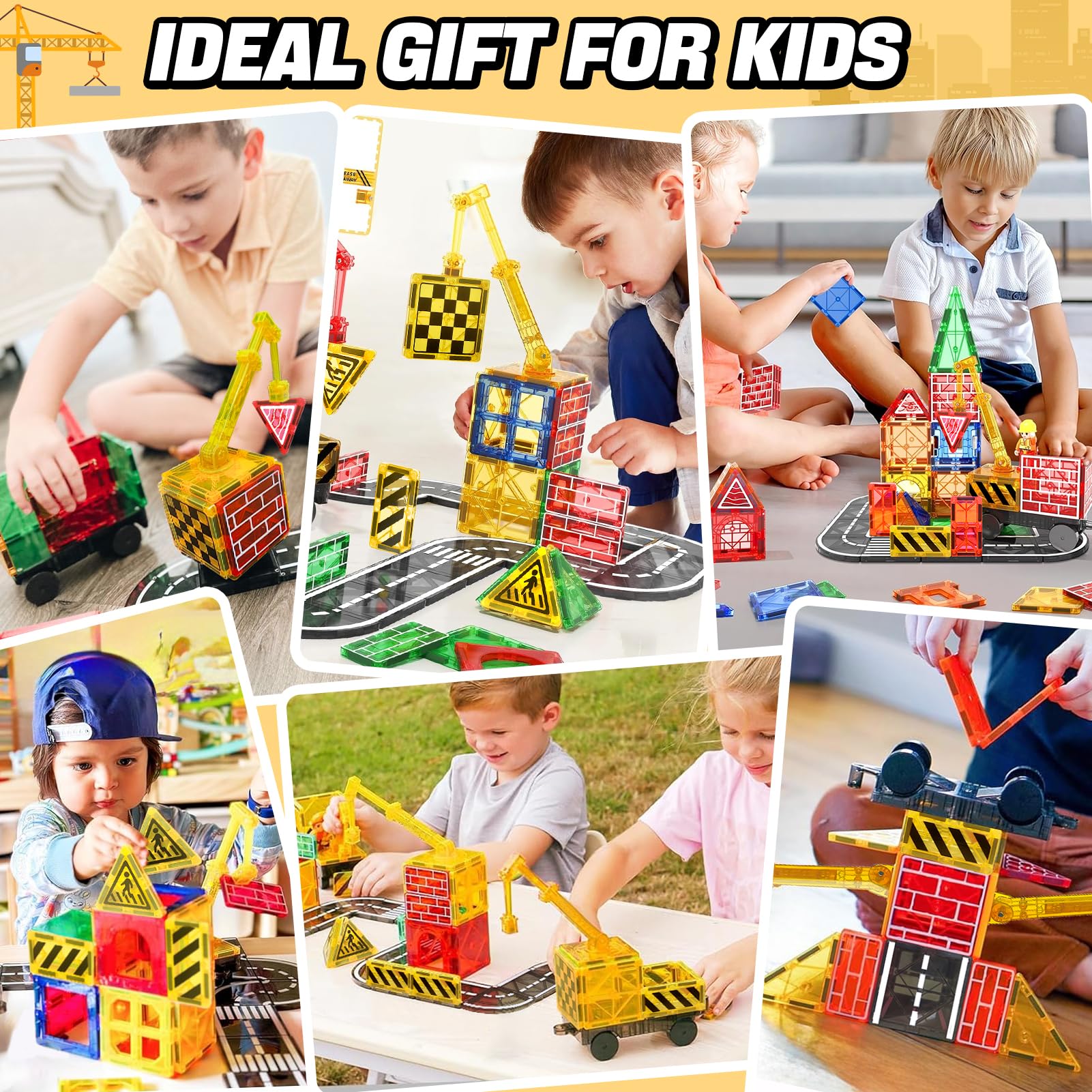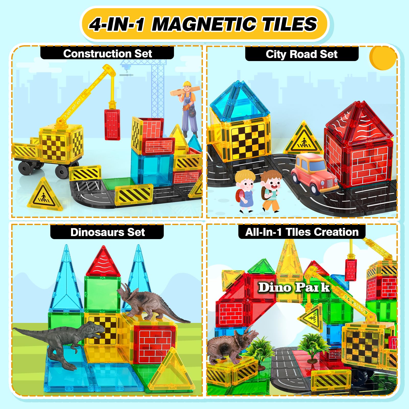 Juego de 40 grúas de construcción innovador con 2 dinosaurios: el kit de construcción de azulejos magnéticos para niños de 3 a 5 4 a 8 años no solo es un juguete de construcción regular, sino que también tiene 3 temas atractivos: un brazo de gravedad de grúa muy flexible para montar grúas, diseño de carretera urbana y viene con 2 dinosaurios.