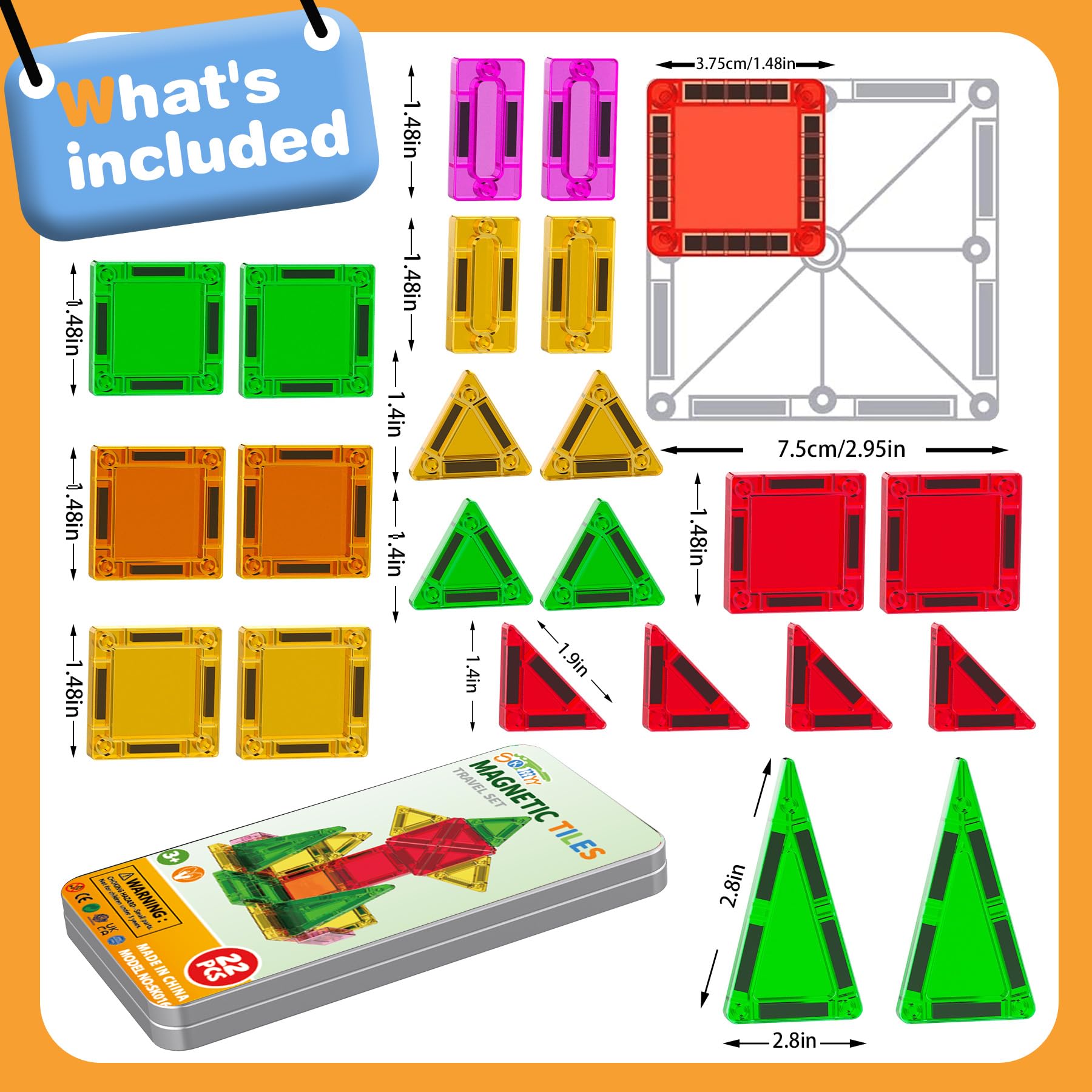 - Juego de mini azulejos magnéticos de bolsillo: 8 cuadrados, 4 triángulos en ángulo recto, 4 rectángulos, 4 triángulos equiláteros, 2 triángulos grandes y un manual de instrucciones creativas. Una caja de hierro resistente imprescindible mantiene todos los mini azulejos fáciles de almacenar y transportar. Se puede almacenar en bolsas escolares, escritorios, mochila de viaje. Ideal para juguetes de viaje y jugar en jardines de infancia.