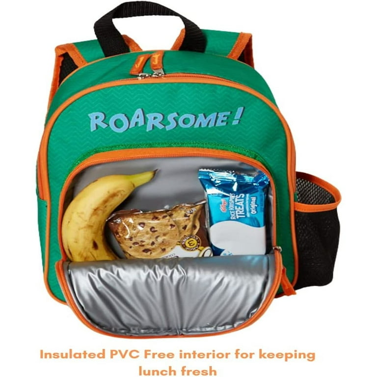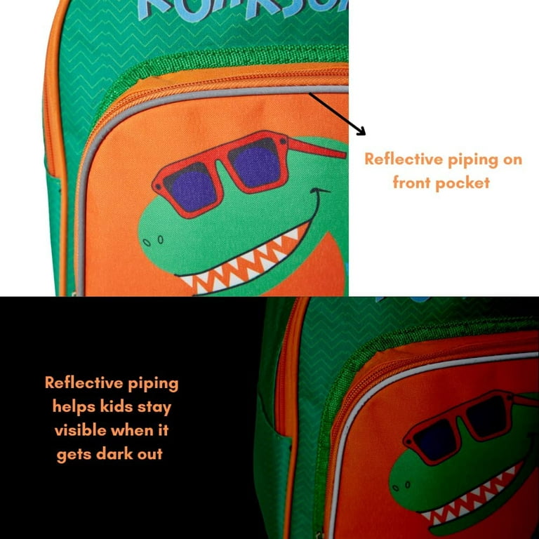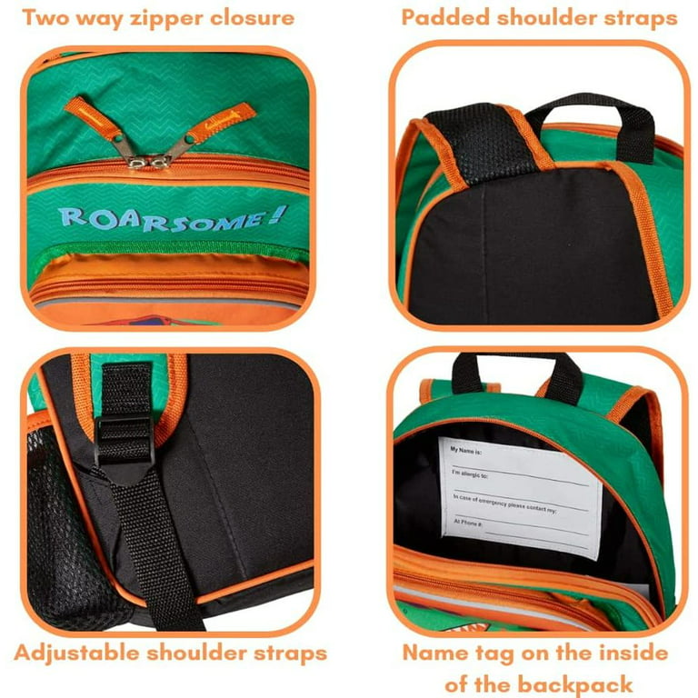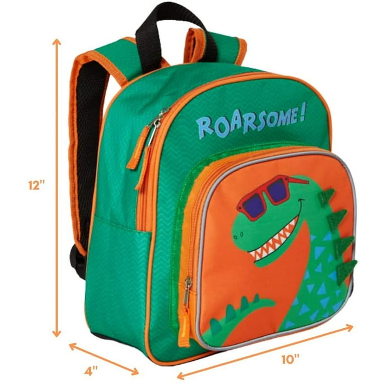 BOLSA ESCOLAR DE DINOSAURIO PARA NIÑOS : un T-Rex "rugiente" en el bolsillo delantero con púas de fieltro en 3D adorna esta mini mochila para niños pequeños y pequeños. La mochila de dinosaurio cuenta con un gran bolsillo frontal aislado que también funciona como lonchera, un bolsillo lateral de malla para la botella de agua y una etiqueta interior con el nombre.