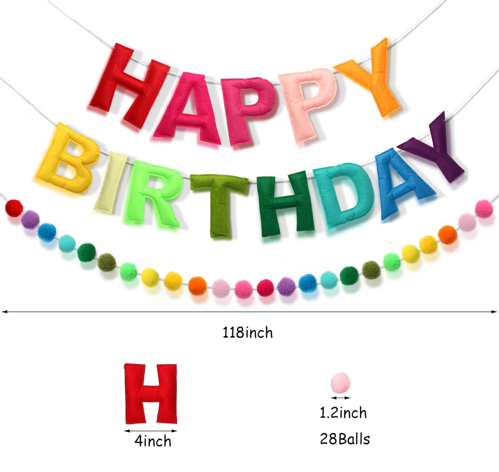 Cartel de feliz cumpleaños, guirnalda de bolas de fieltro de color arcoíris
