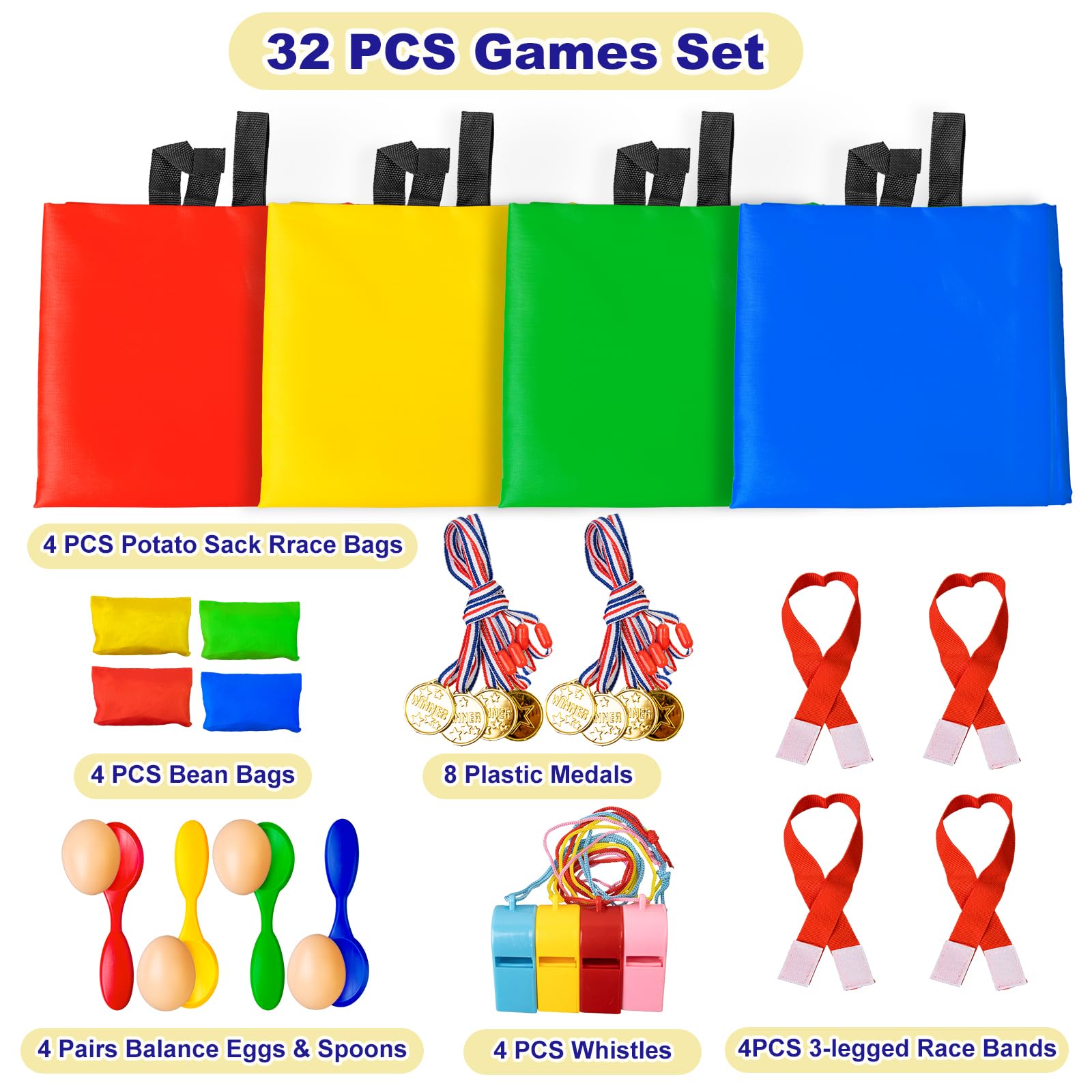 - Juegos 4 en 1 para niños: el juego de 32 piezas es adecuado para 4 a 8 jugadores, los colores de nuestras bolsas de carreras te hacen más llamativo en el juego, el juego incluye 4 coloridas bolsas de carreras de sacos de patatas adecuadas para adultos y niños, 4 bolsas de frijol, 4 cinturones de carreras de tres patas, 4 huevos y cucharas de plástico, 4 silbatos y 8 medallas de plástico para recompensar a los niños ganadores.