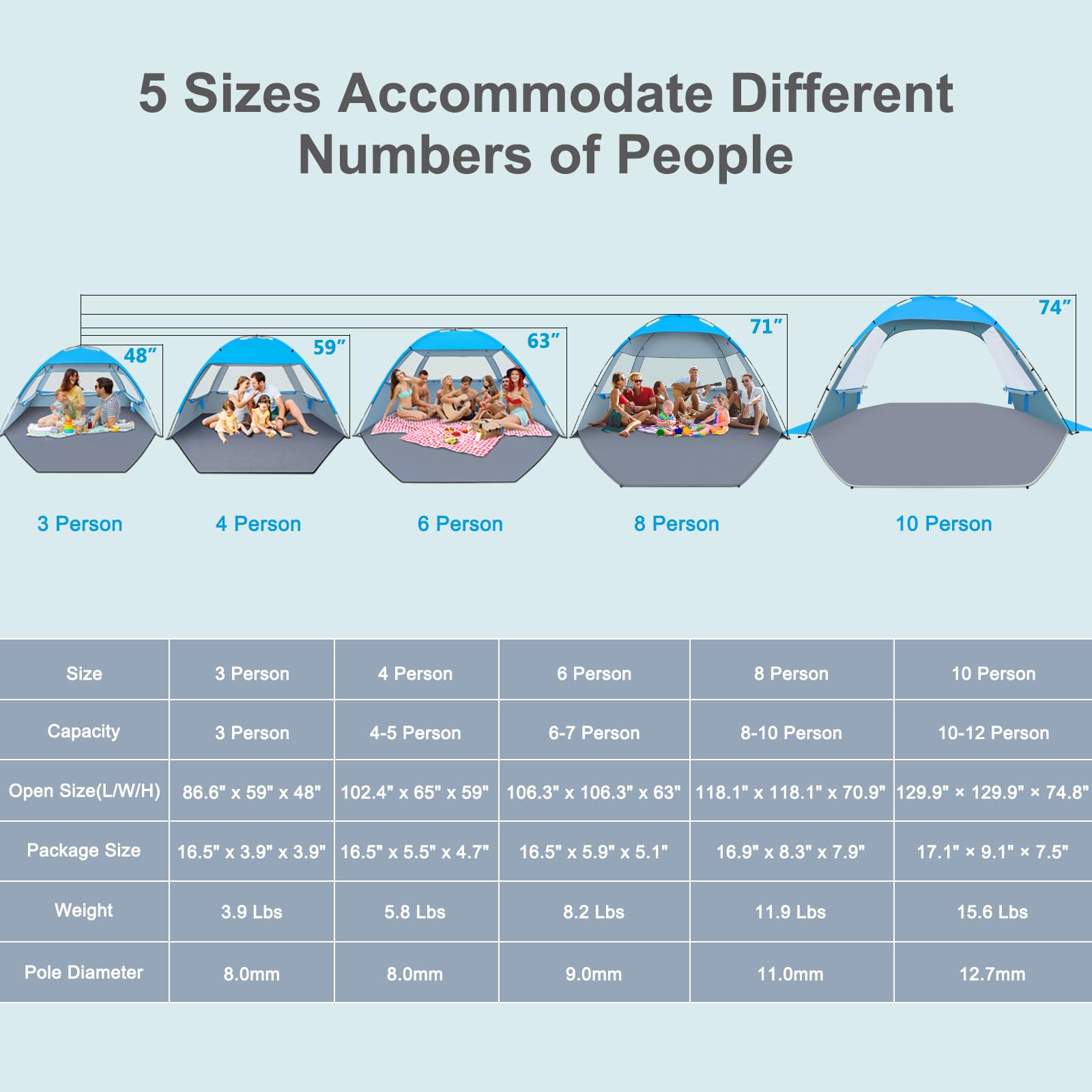 - Con espacio muy grande: De 102.4 pulgadas de largo x 65 pulgadas de ancho x 59.1 pulgadas de alto, 45 % más grande que otras tiendas de campaña de playa desplegables, caben de 4 a 5 personas. Proporciona un espacio cómodo y grande para familiares y amigos en la playa. El suelo se extiende 43 pulgadas dando un espacio adicional para tus actividades.