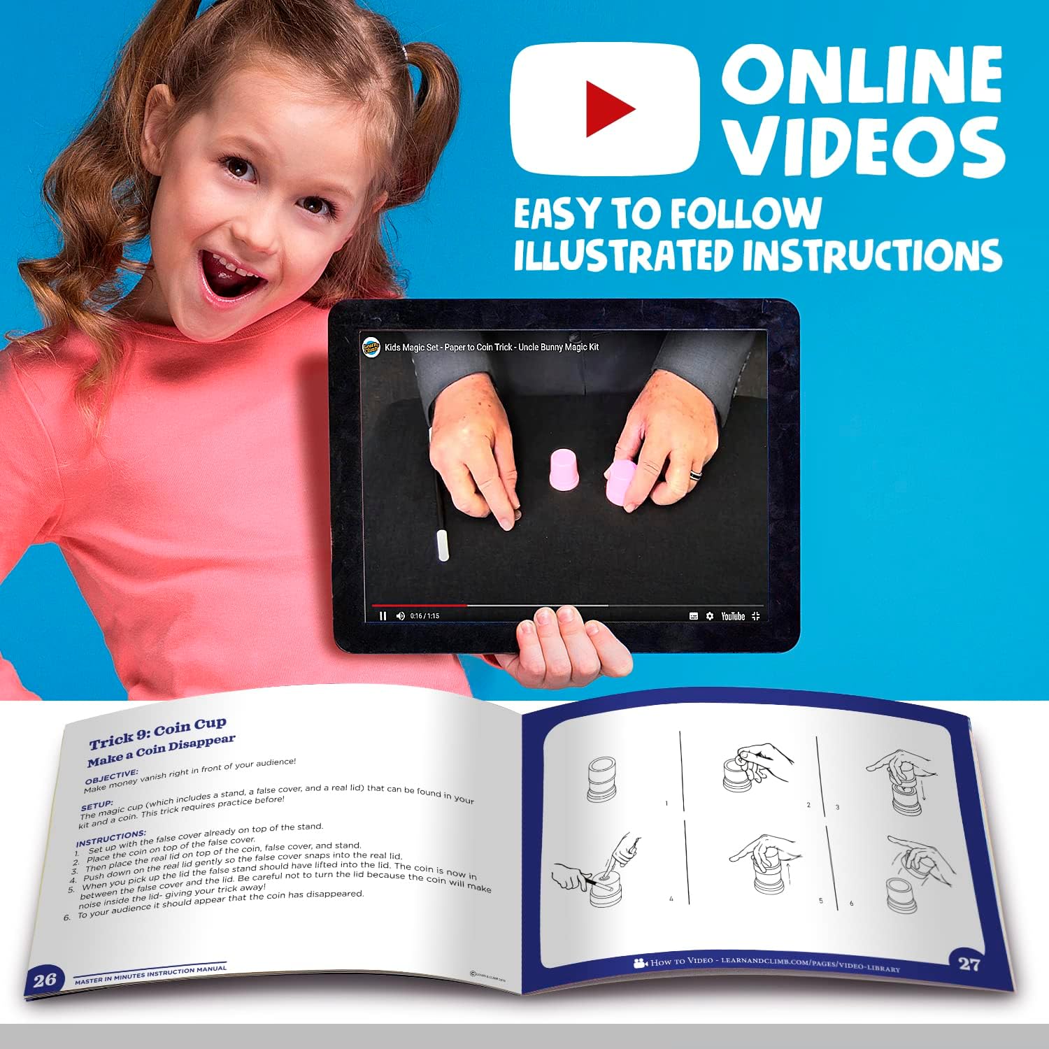 ¡Dé el regalo que sigue dando! Este juego de magia para niños ofrece horas de entretenimiento: incluye un manual de instrucciones claro y apto para niños. ¡ADEMÁS, puedes desbloquear enlaces a videos en línea de un mago real que enseña cada truco! ¡Tiene todo lo que necesitas para despertar al mago que vive dentro de cada niño!