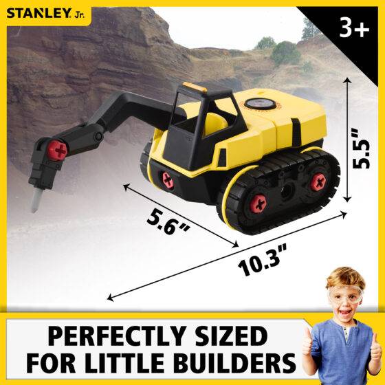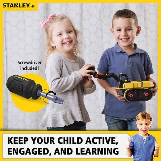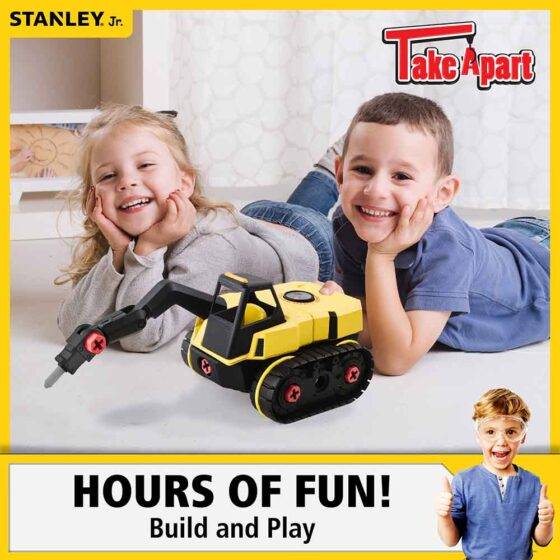 *caja con detalles* El Stanley Jr Take Apart Jackhammer Kit viene con 24 piezas, incluido un destornillador para montar y desmontar y una figura. Deja volar tu imaginación a través de la diversión de la construcción.