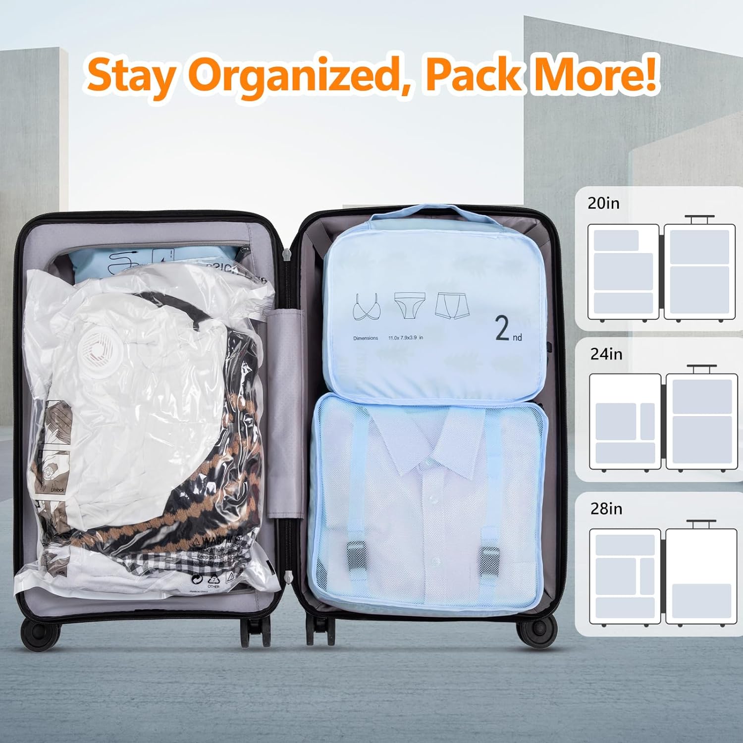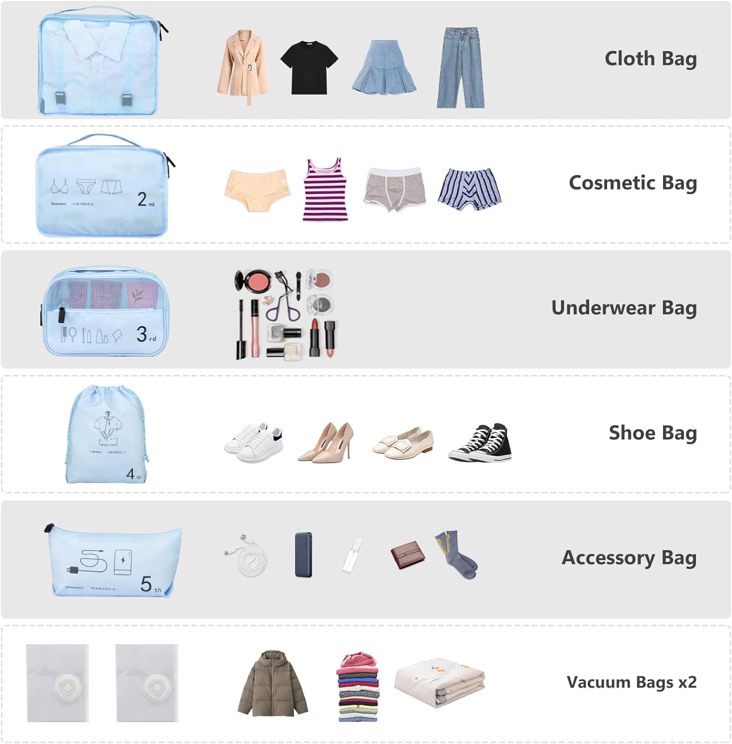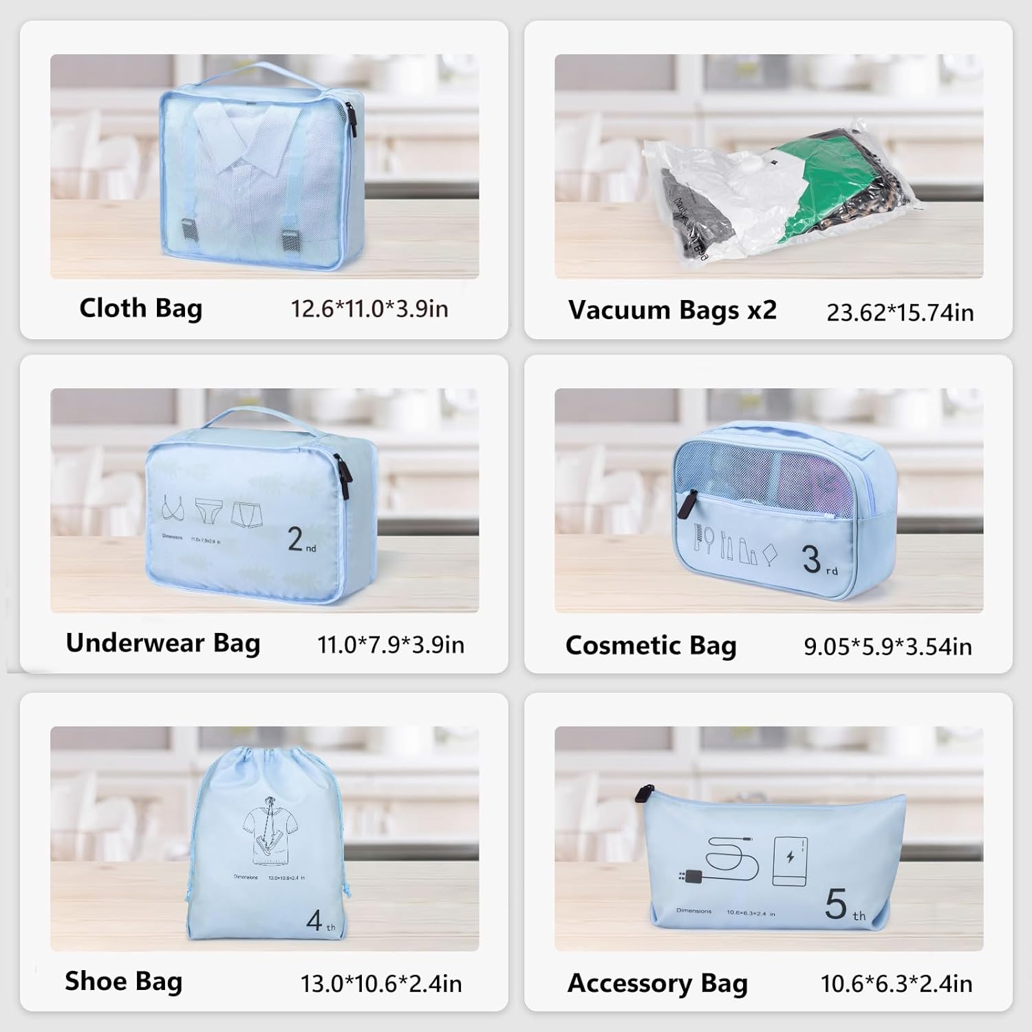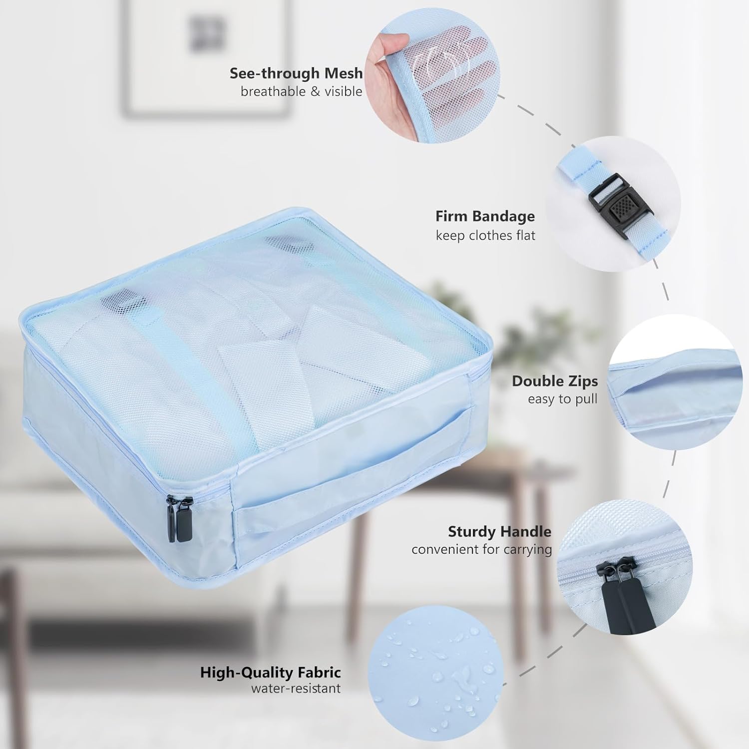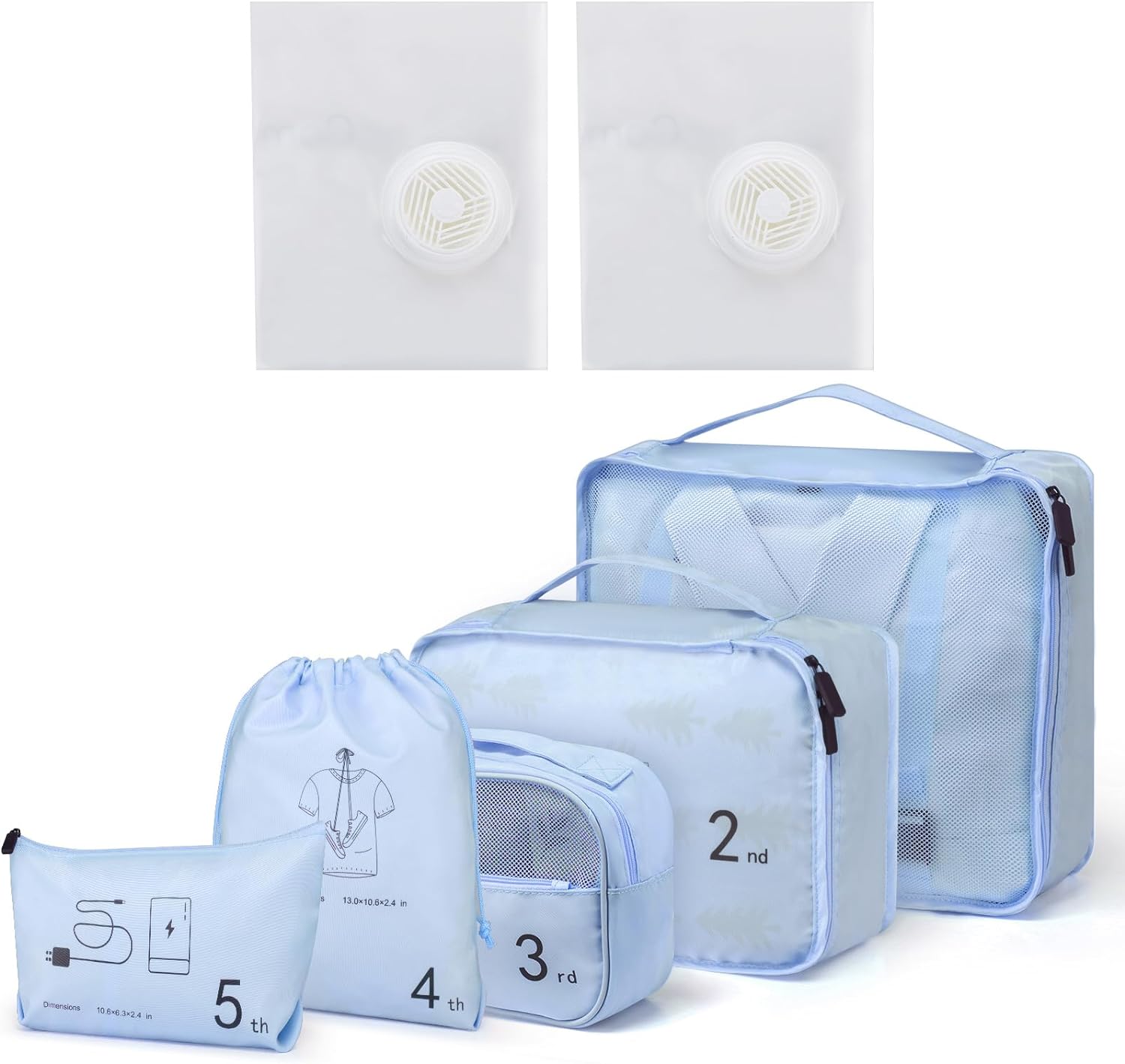 Juego de 7 cubos de embalaje de malla para equipaje, celeste