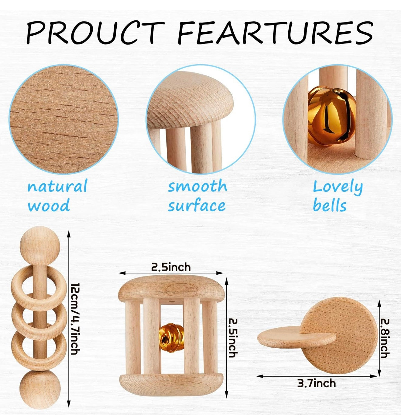 3 piezas de sonajero de madera, campanas