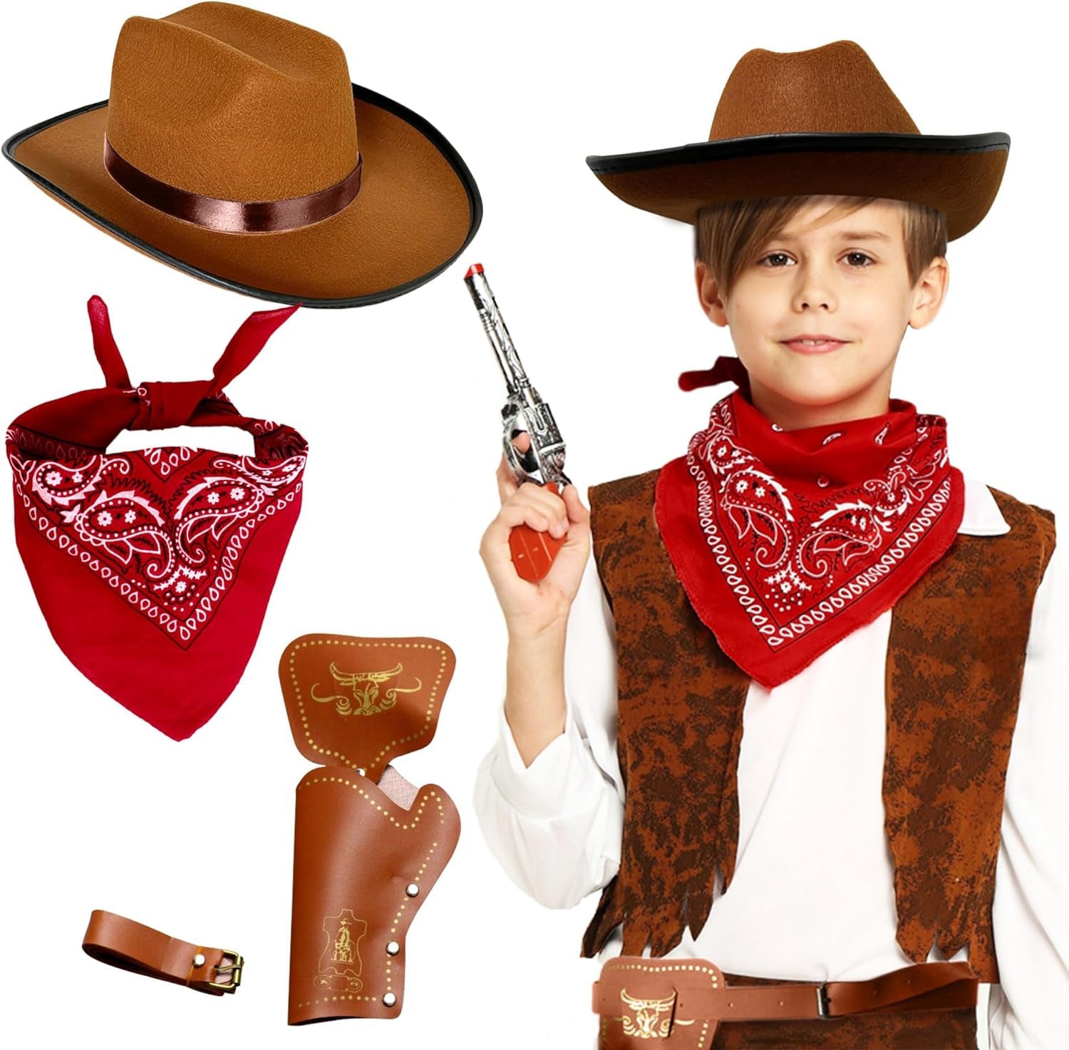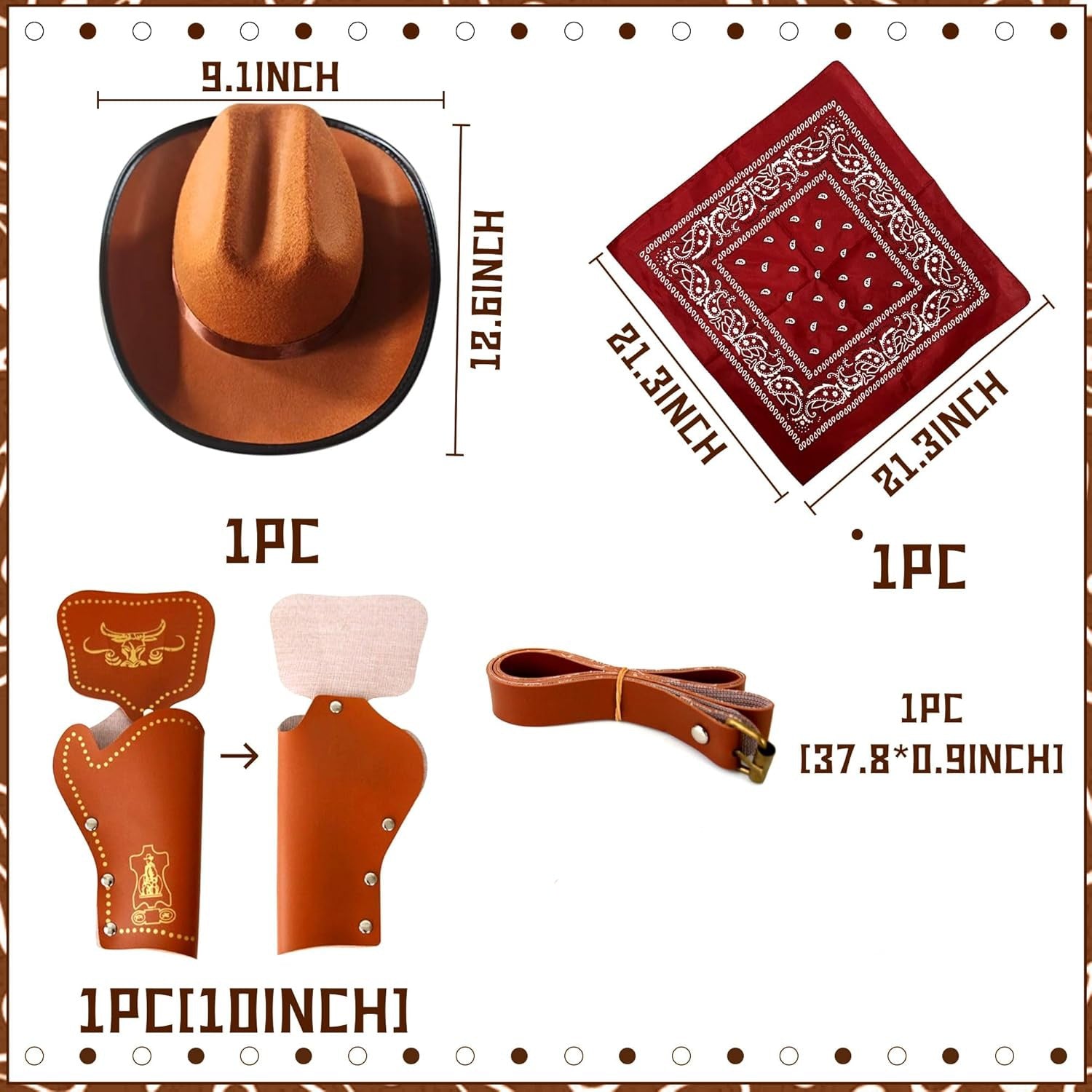 Lo que recibirás: 1 x sombrero de vaquero, 1 x pañuelo rojo, 1 x cinturón, 1 x estrella plateada