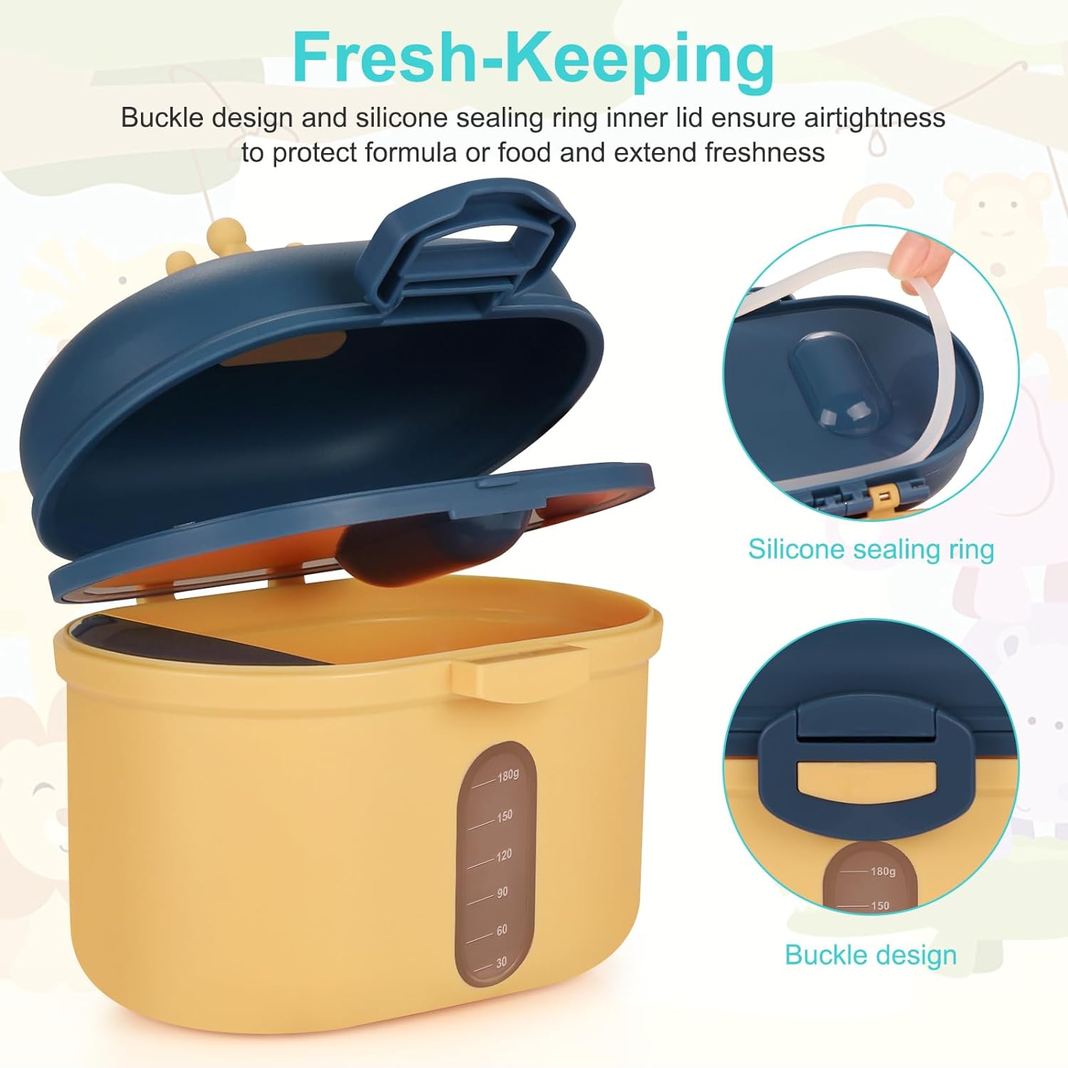 Contenedor de leche en polvo sellado: la tapa interior fija un anillo de sellado de silicona, la tapa exterior tiene un diseño de hebilla y hay una doble barrera para garantizar la frescura de la leche en polvo y los alimentos.