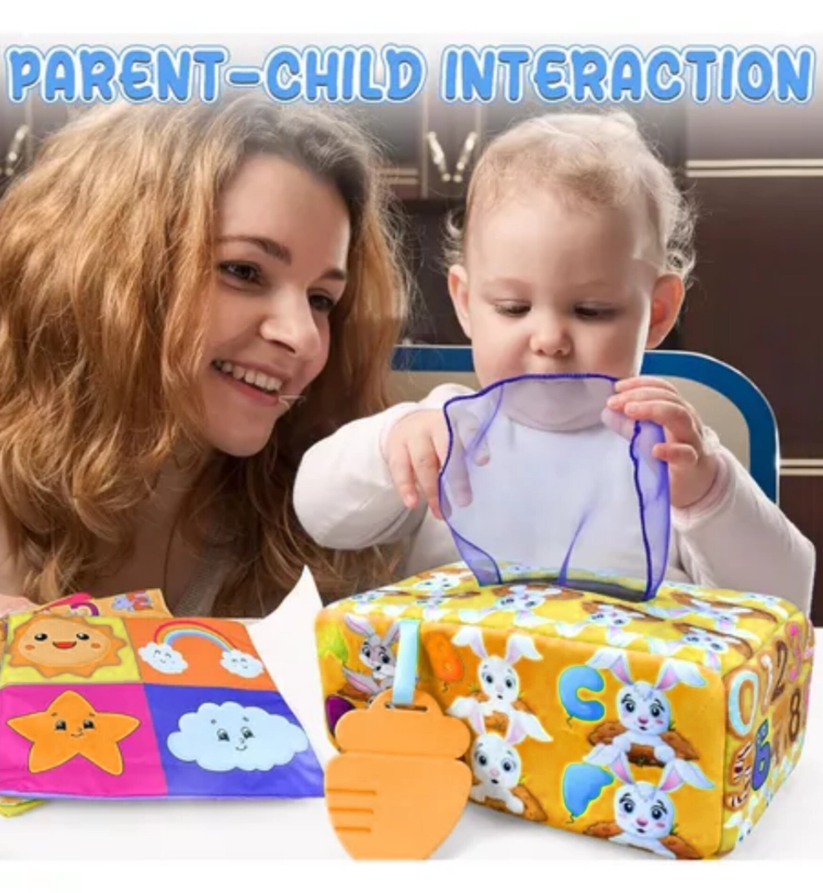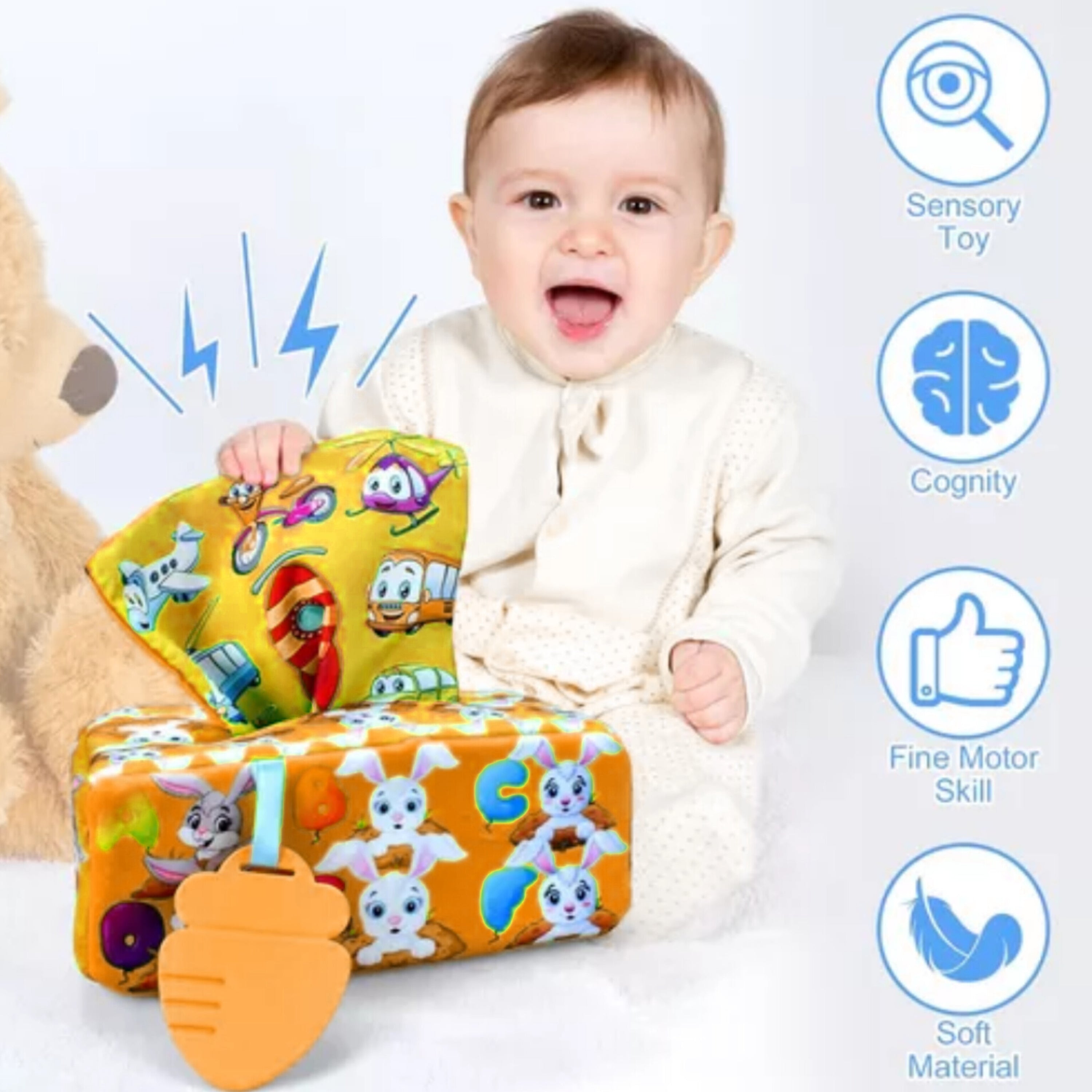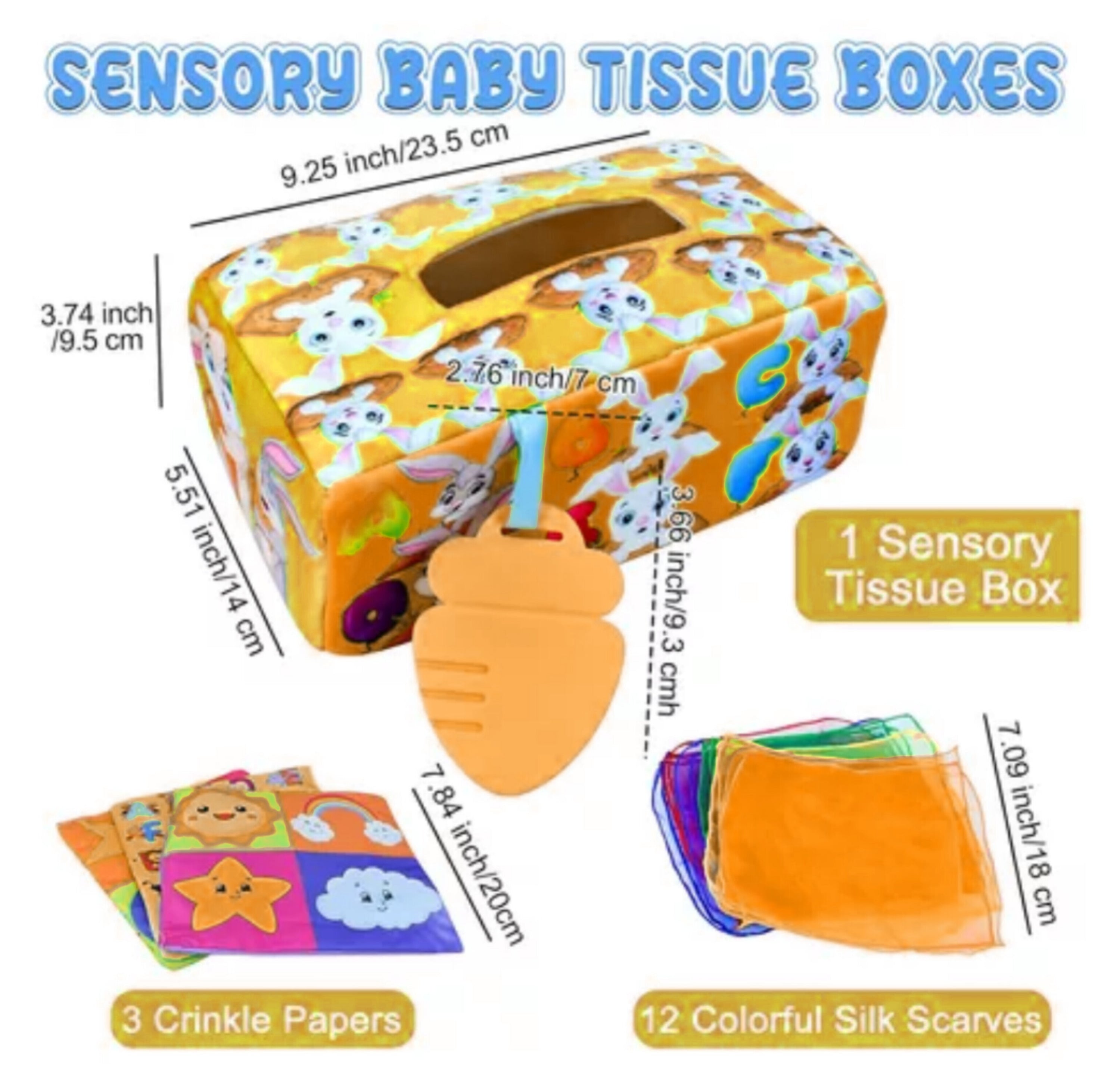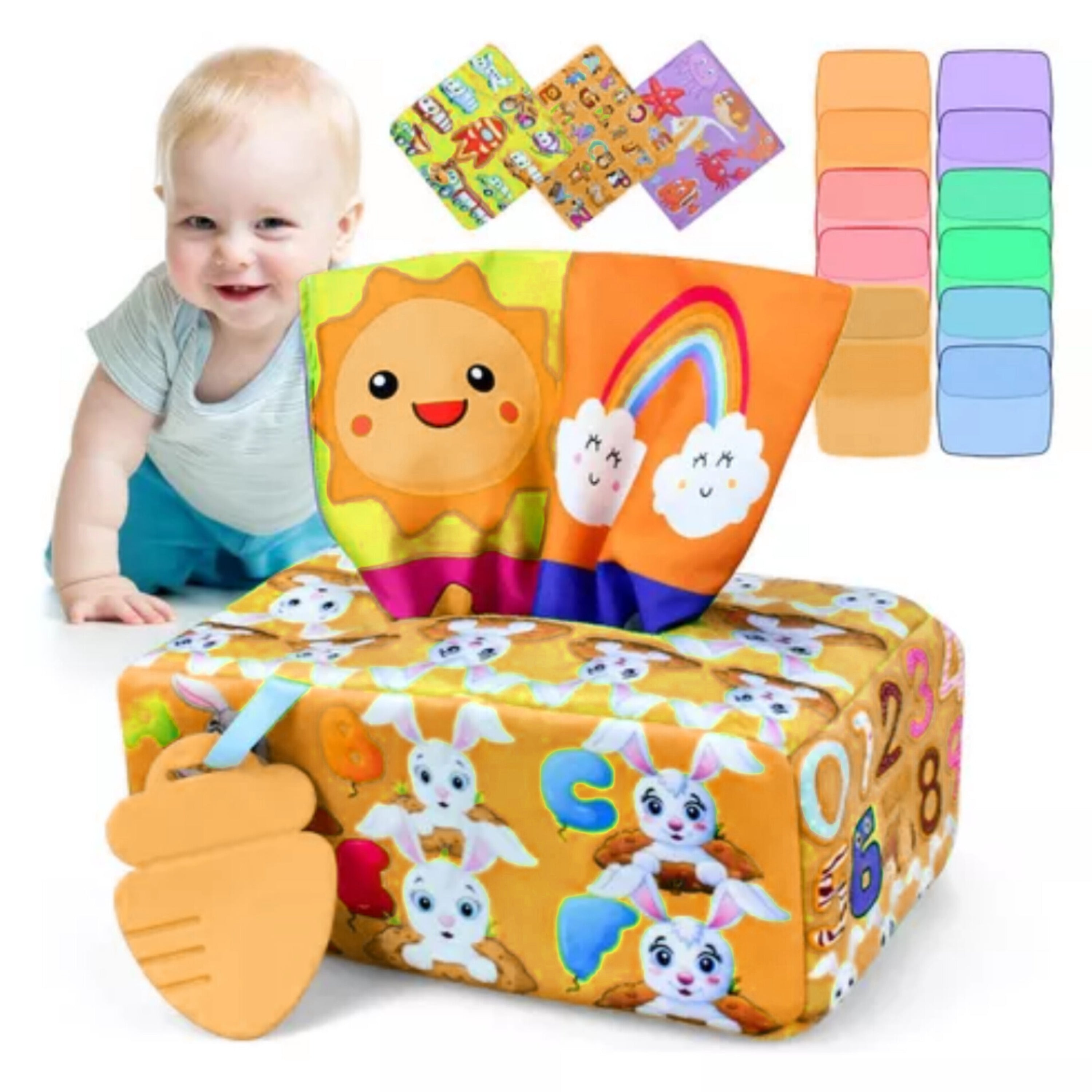 -Juguetes sensoriales Montessori divertidos: la caja de panuelos magicos es un juguete sensorial de desarrollo temprano para bebes y ninos pequenos, al bebe le gusta sacar los tejidos faciales de una caja, uno por uno, por lo que disenamos este juguete sensorial seguro y divertido simulando el comportamiento de los bebes. Esta caja de panuelos sensoriales entretendra a los bebes durante horas con sus colores vibrantes, sonidos arrugados y diversion al tirar. Promueve las habilidades sensoriales de los ninos mediante texturas, sonidos y reconocimiento de color.