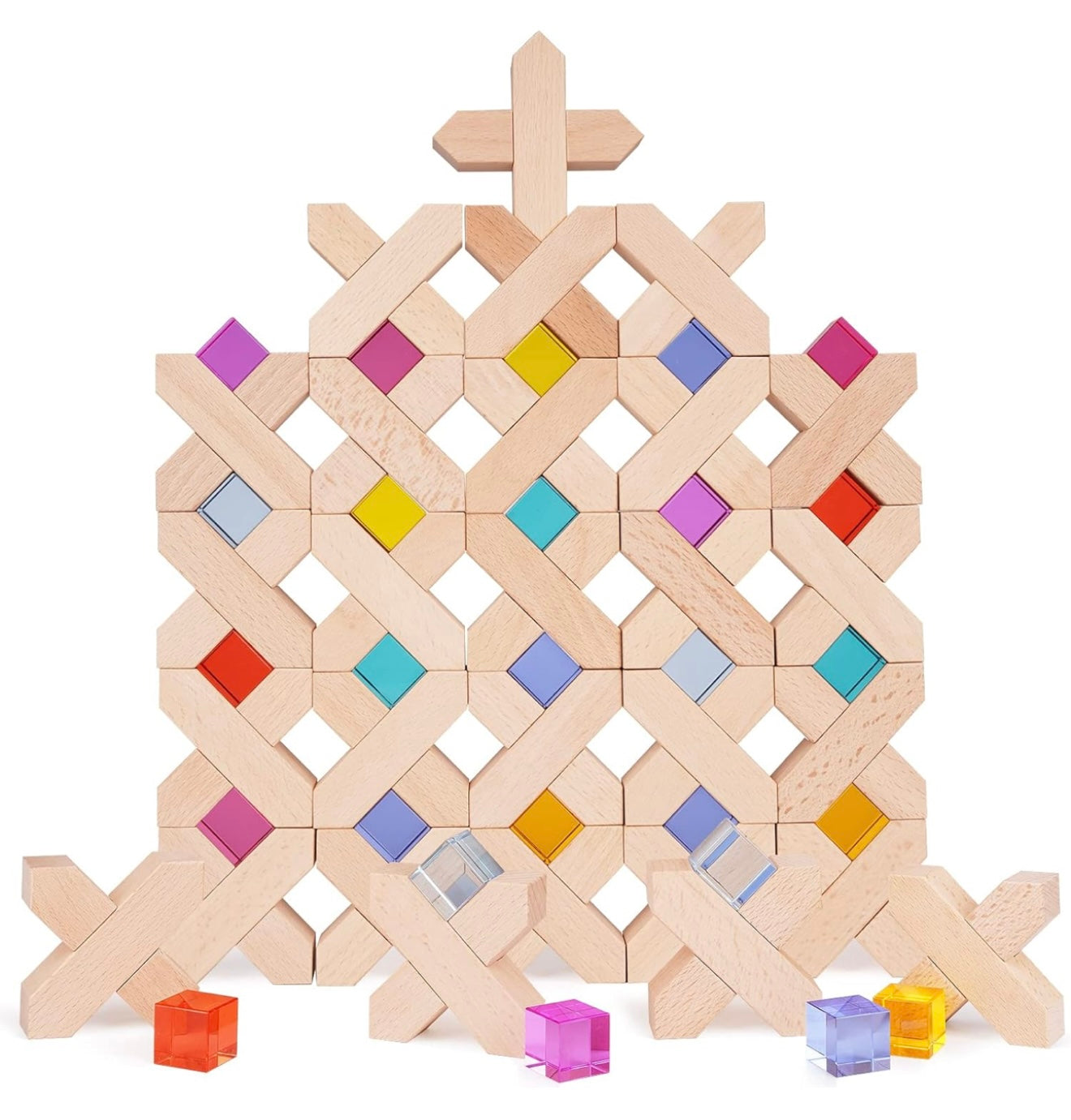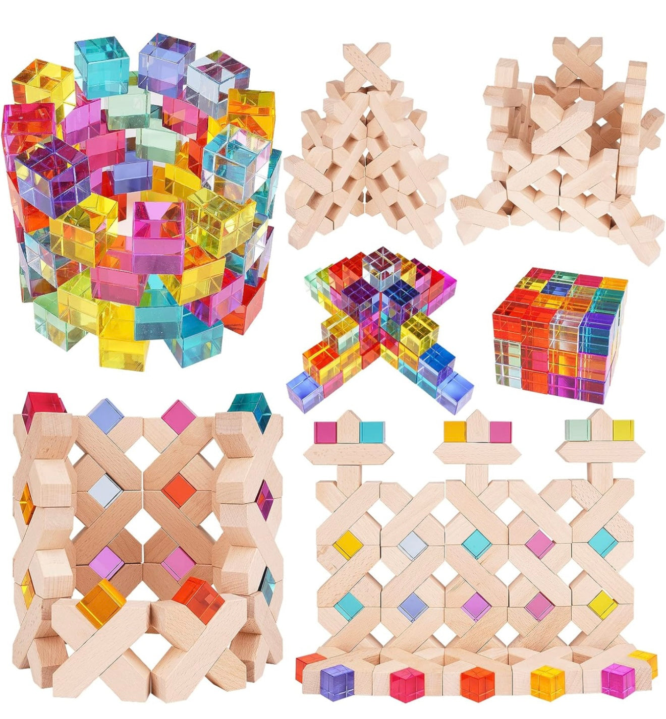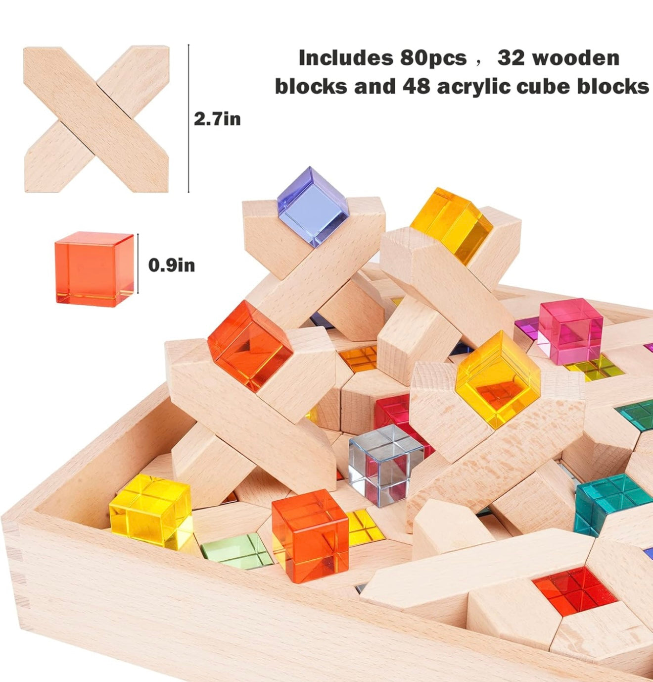 Agirlgle Bloques de construcción de madera arco iris, cubo de bloques apilables de gemas