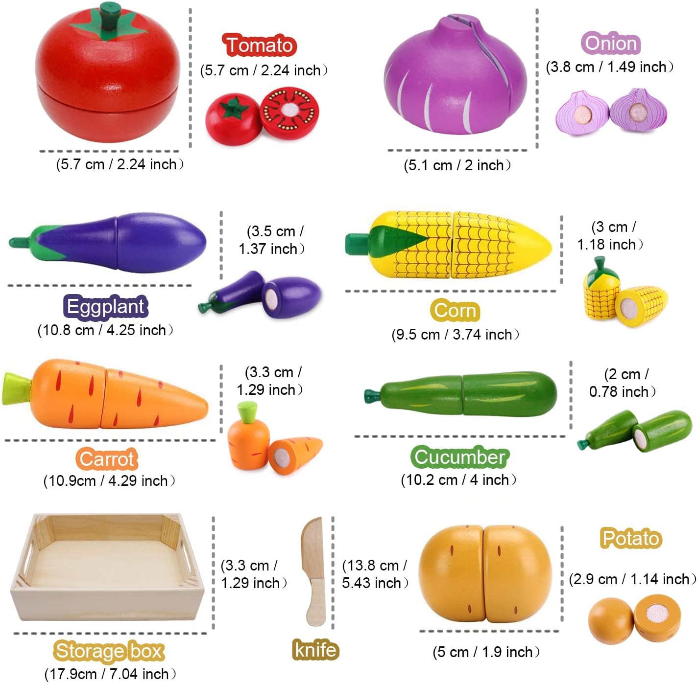 【Variedad de verduras】El juego comida madera juguete incluye cebolla, maíz, zanahoria, pepino, berenjena, tomate, un cuchillo de madera y una caja de almacenamiento. Una variedad de verduras para empezar una fiesta de frutas. Anime a los niños a reconocer una variedad de vegetales y colores.
