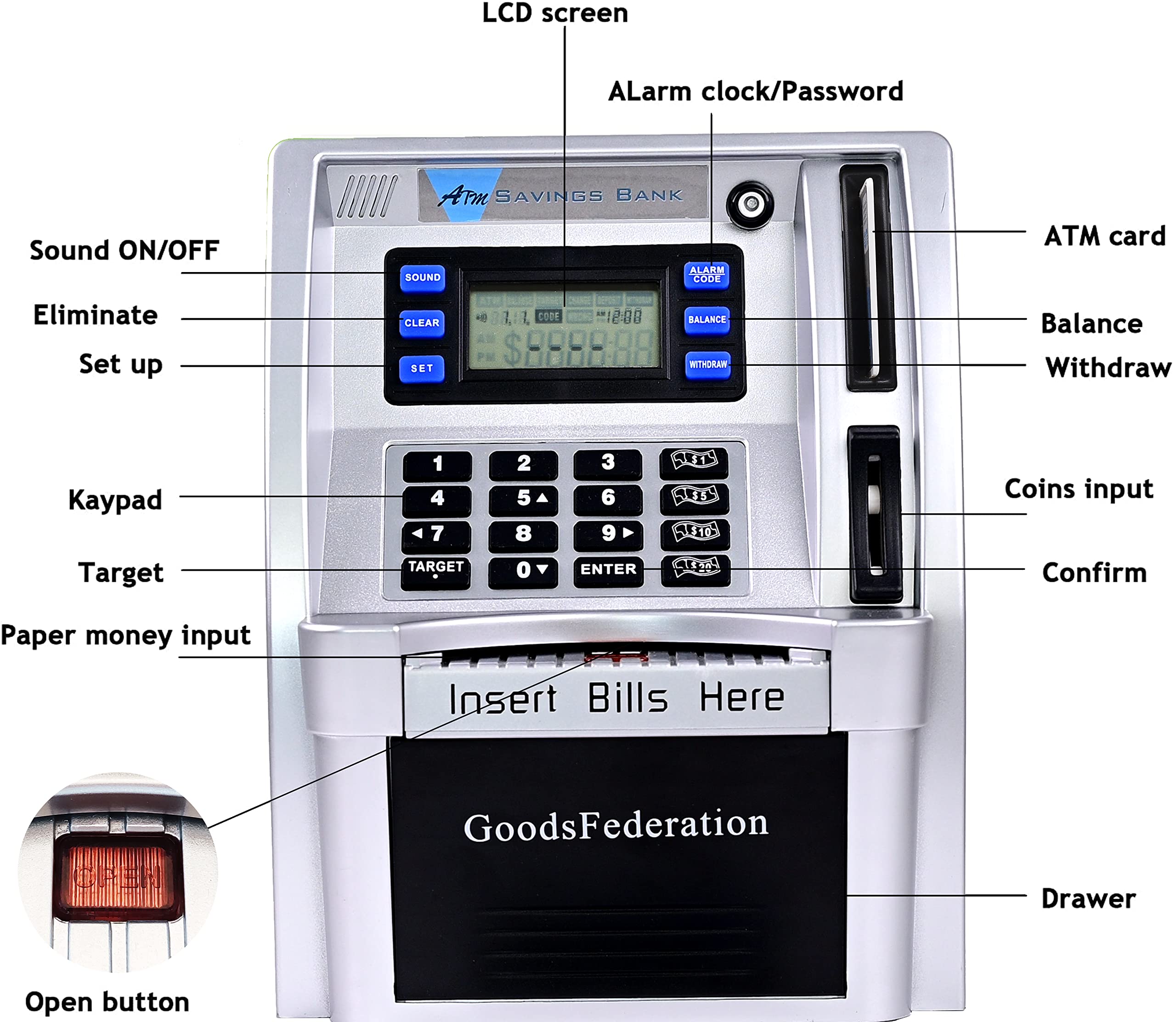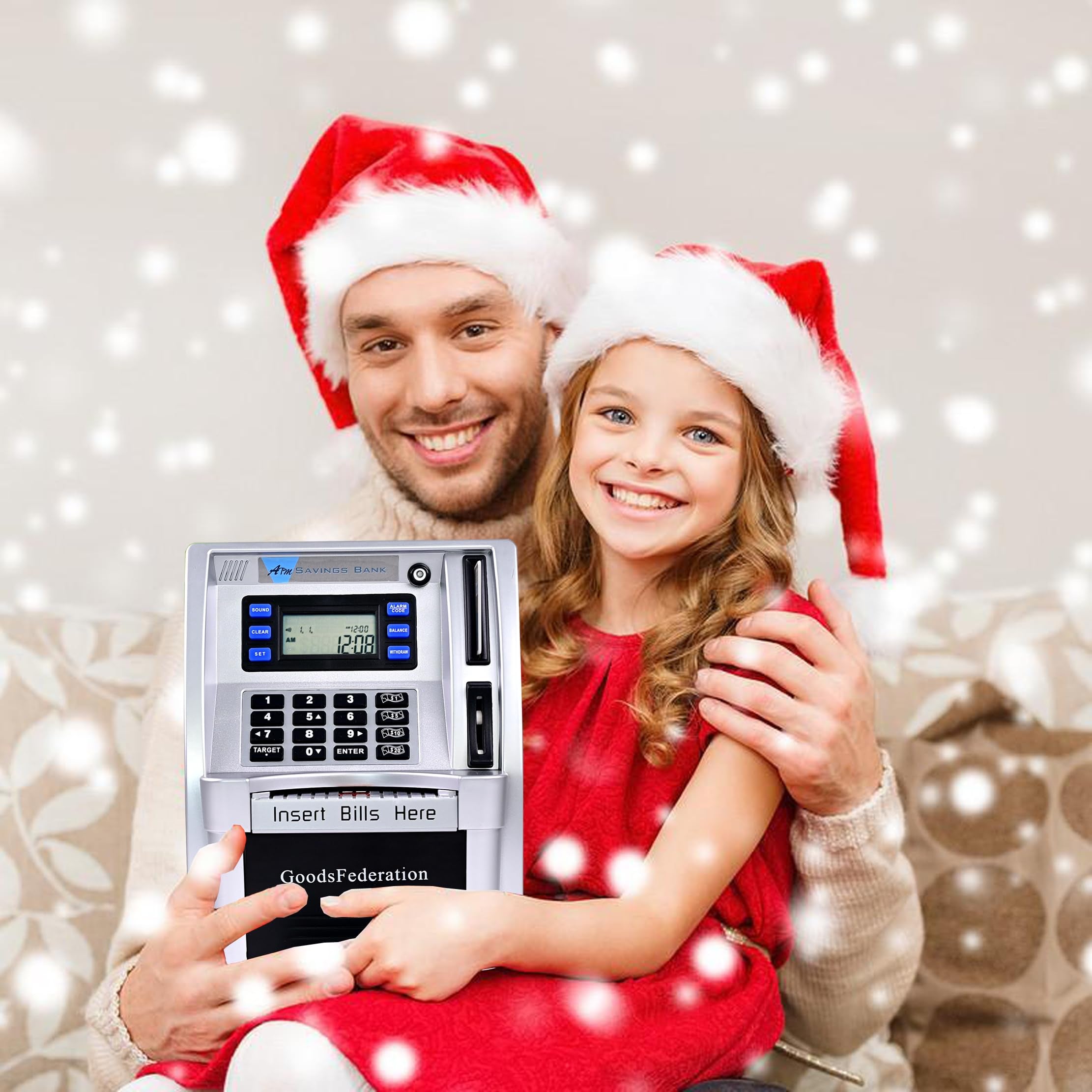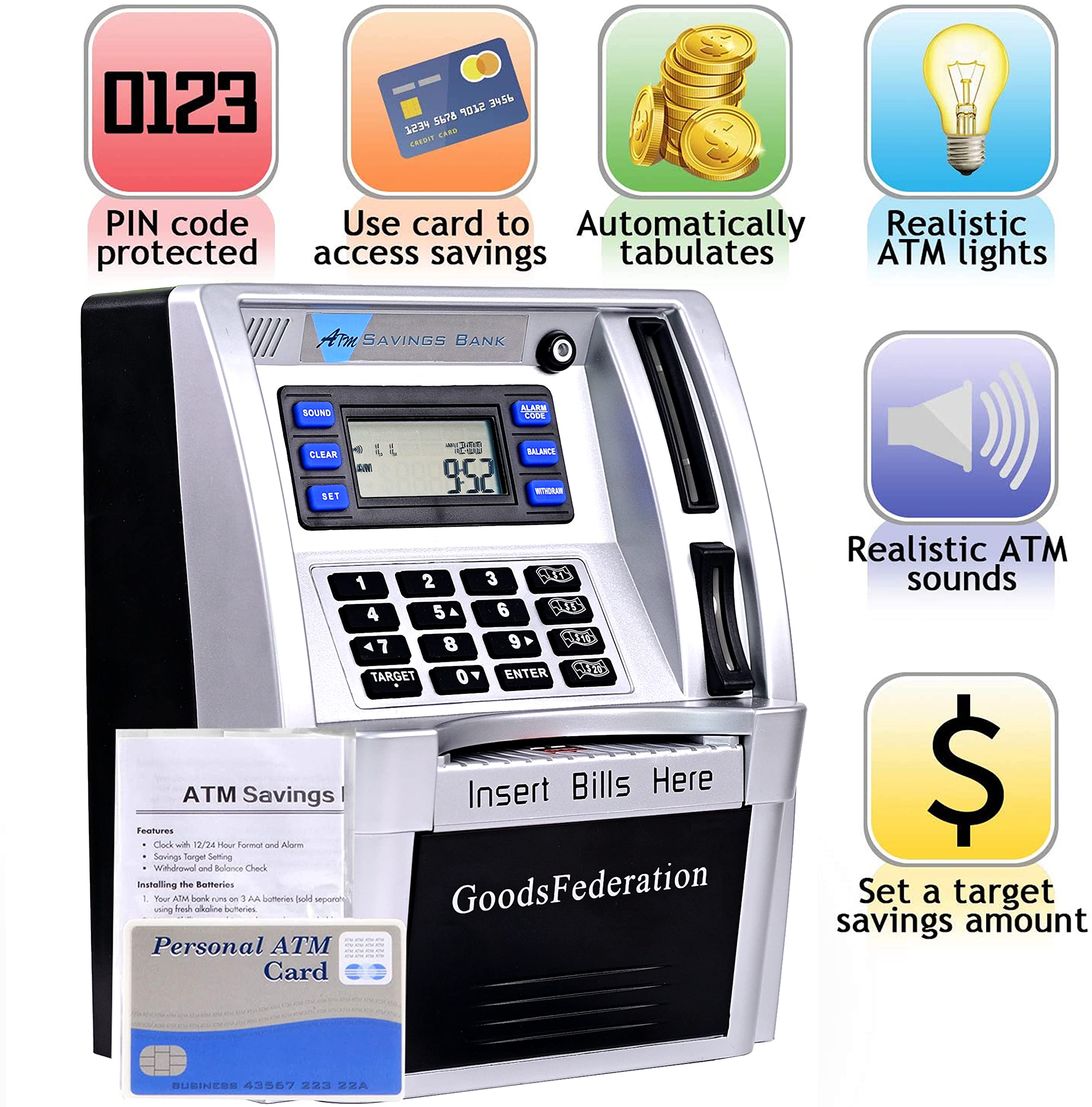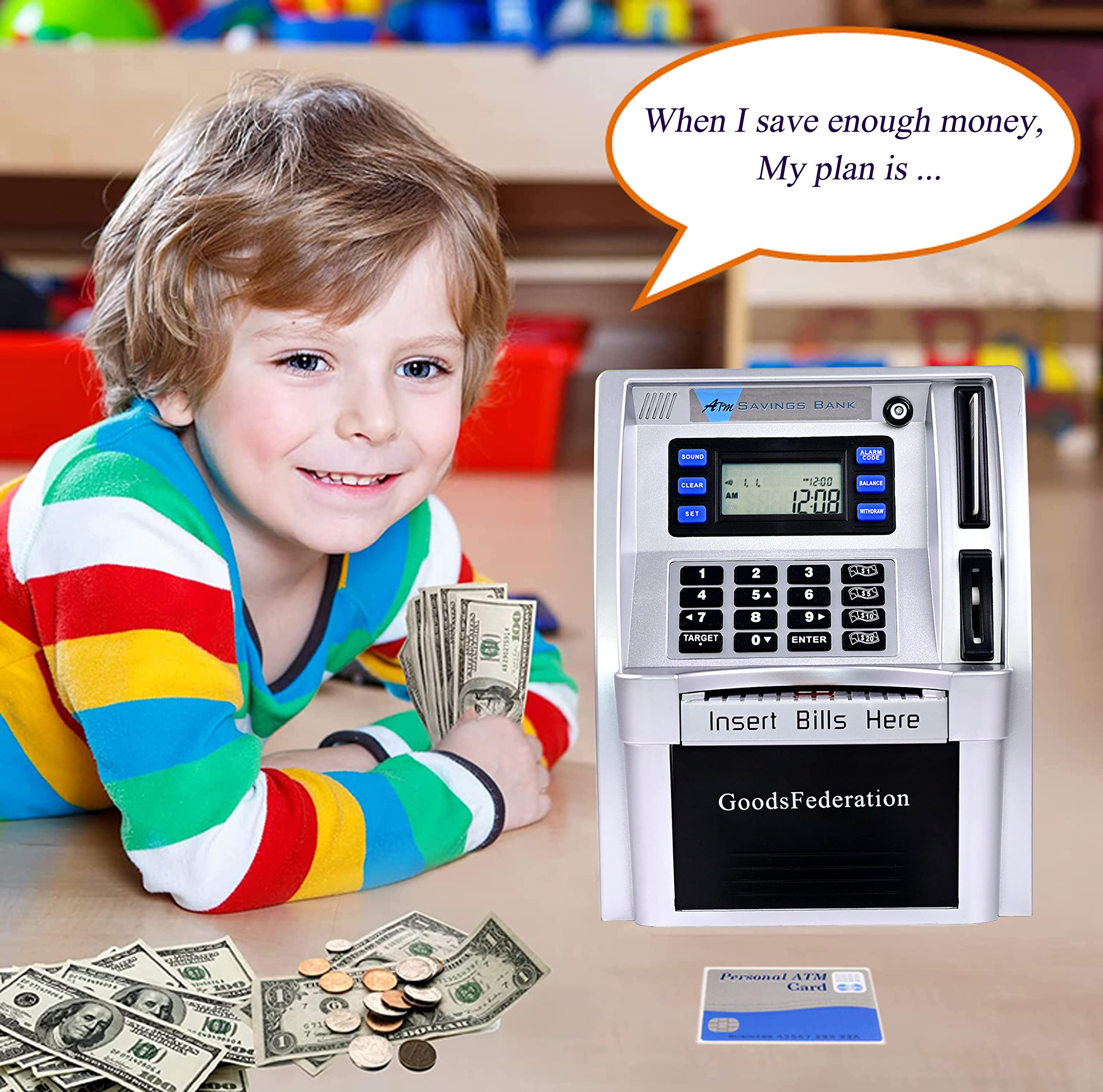 Alcancía de cajero automático para niños con tarjeta de débito de memoria de apagado para dinero real