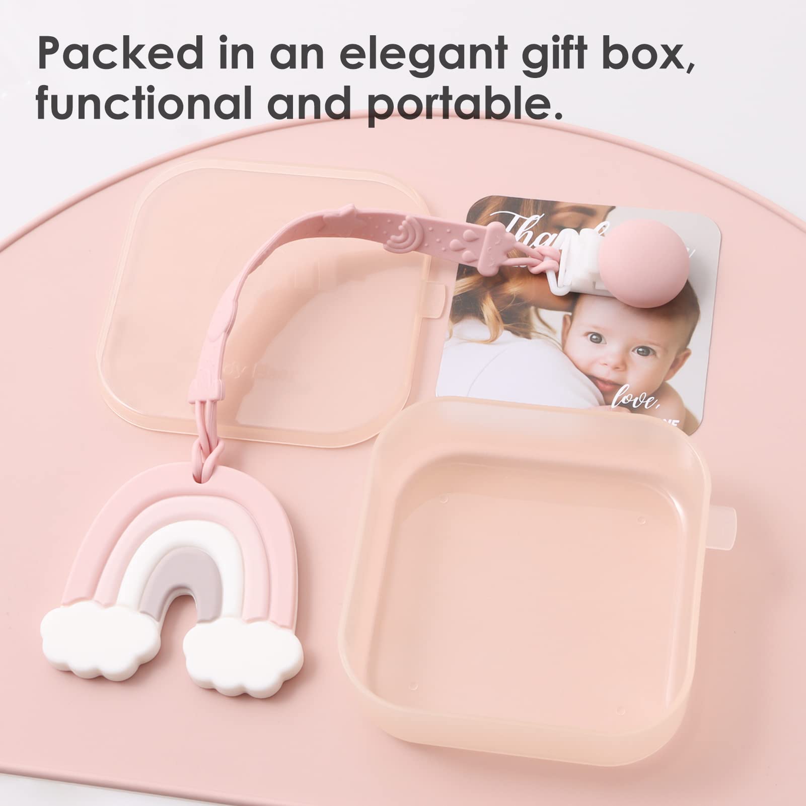 *Caja con detalles*. Diseño de una sola pieza: los juguetes mordedores de silicona para bebé seguros, elegantes y multifuncionales cuentan con un clip de chupete de diseño de una sola pieza y un divertido diseño de mordedor de No hay necesidad de preocuparse por que se caiga, y no hay peligro de asfixia. El mordedor único de derechos de autor combina colores suaves y múltiples texturas, tanto los juguetes mordedores como los clips son duraderos y fáciles de sostener, permite que tu bebé lo use sin carga.