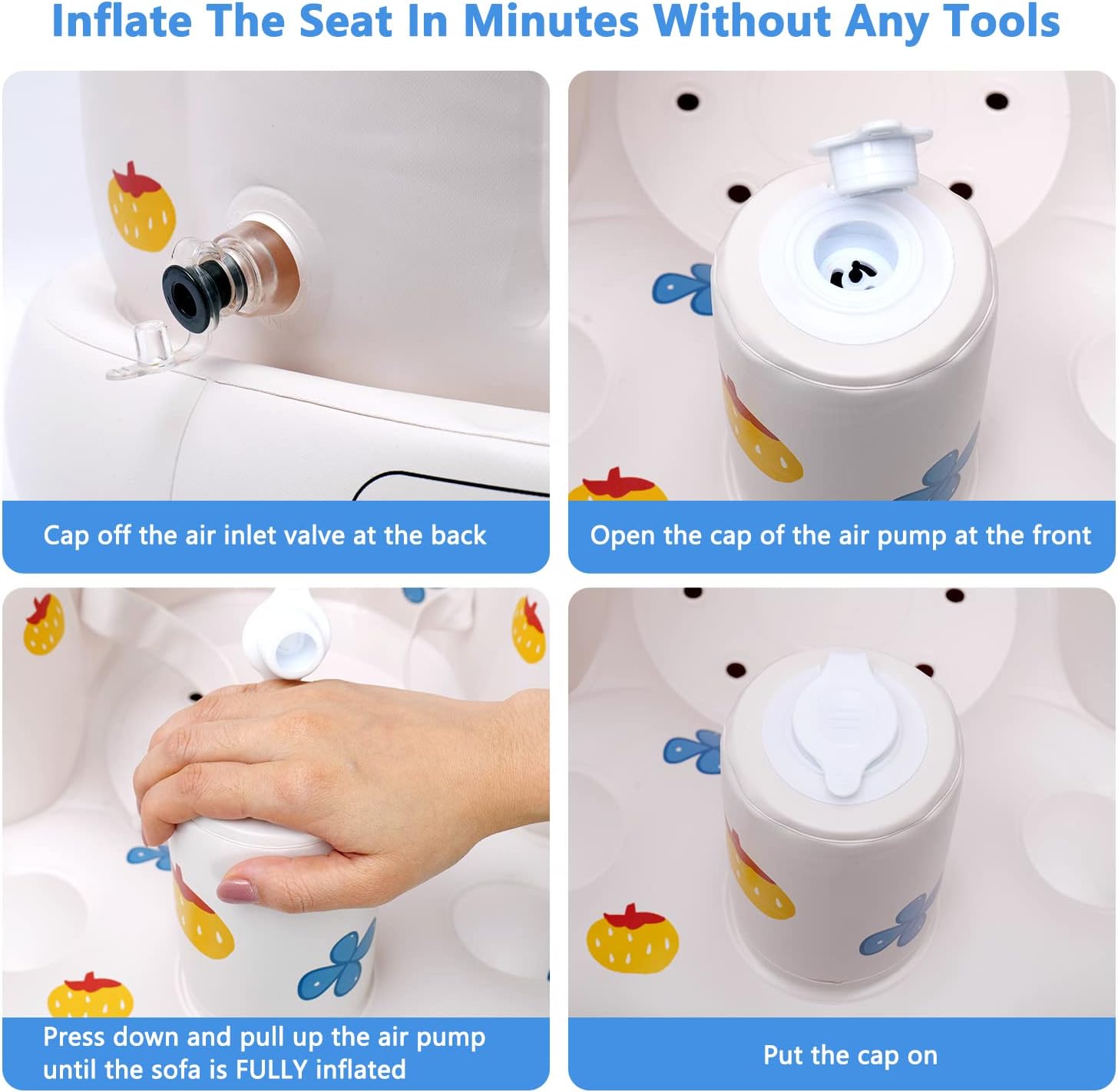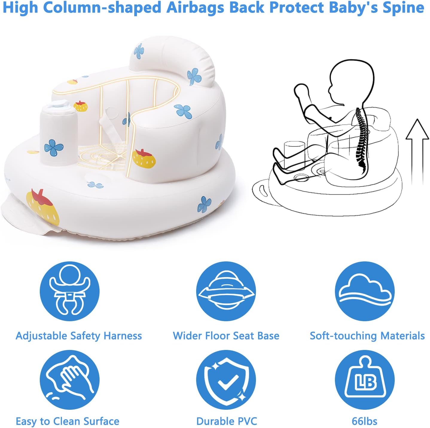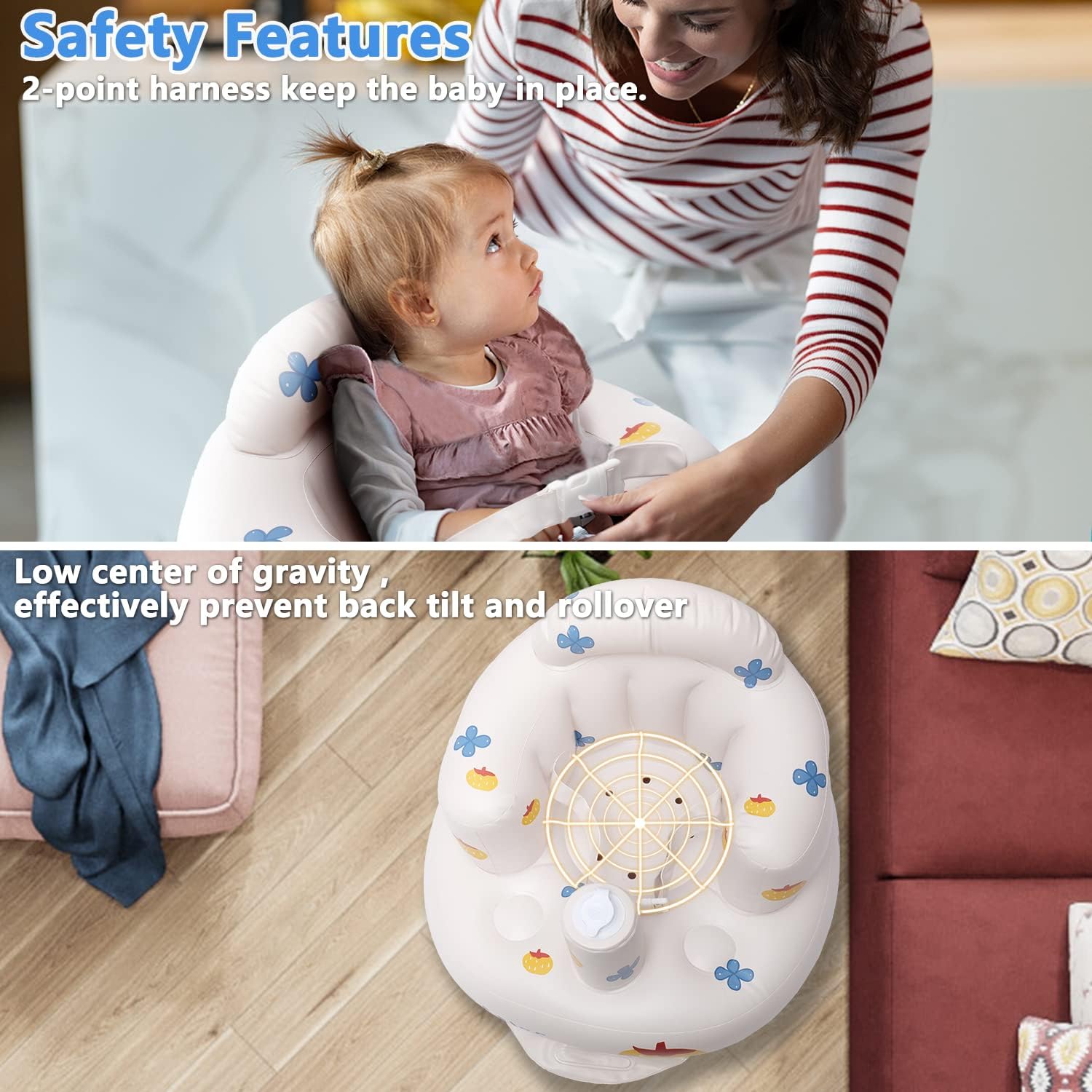 Asiento de seguridad y apoyo: este asiento inflable para bebé está diseñado para proporcionar apoyo a tu bebé mientras aprende a sentarse. Tiene un arnés de dos puntos y una parte trasera de bolsas de aire en forma de columna alta que proporcionan una mejor protección y apoyo para la columna vertebral del bebé. La silla también tiene un diseño de centro de gravedad bajo, lo que ayuda a evitar la inclinación de la espalda y el vuelco. Su bebé puede apoyarse cómodamente contra el respaldo del asiento mientras está sentado, jugando o comiendo.
