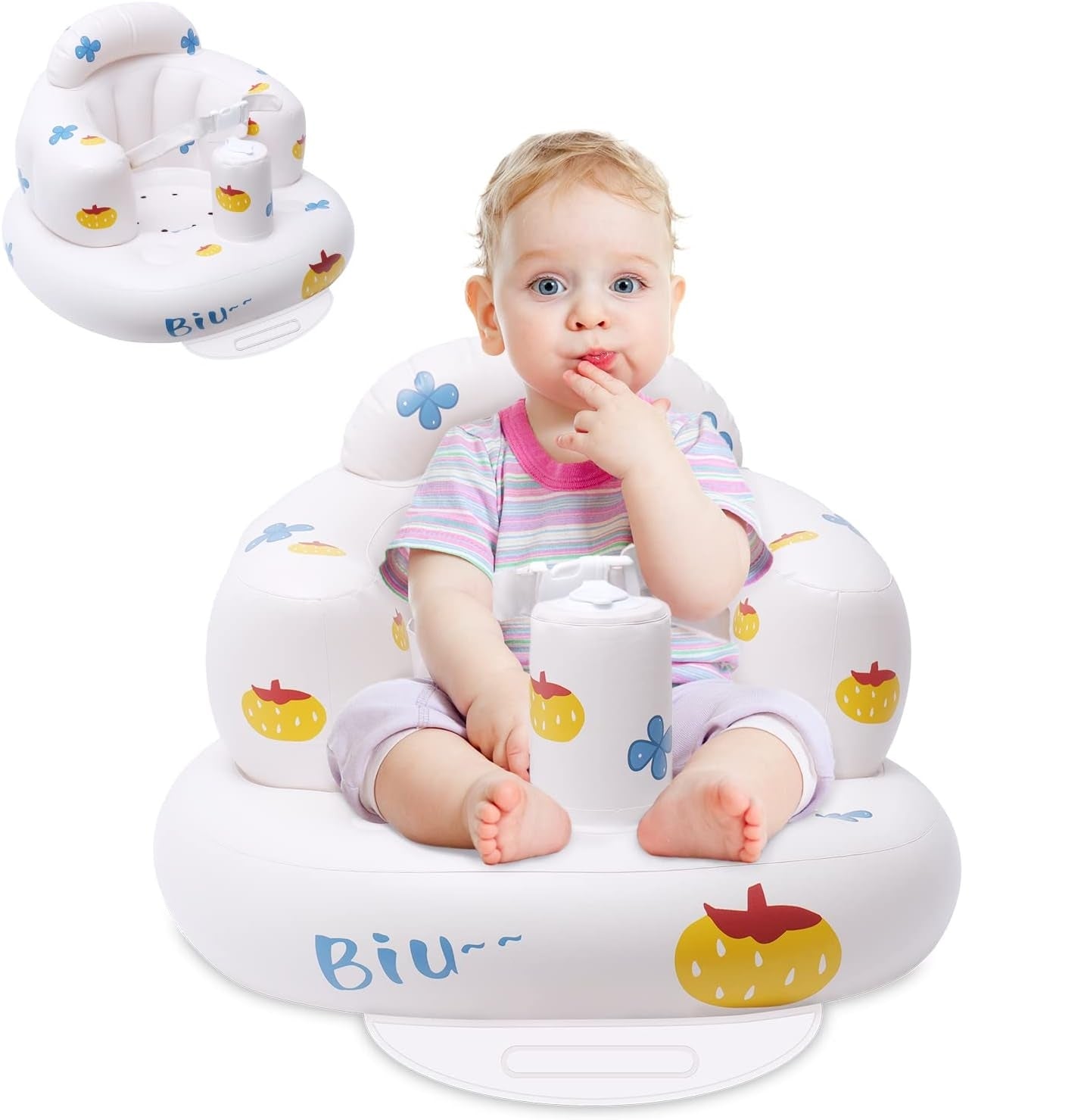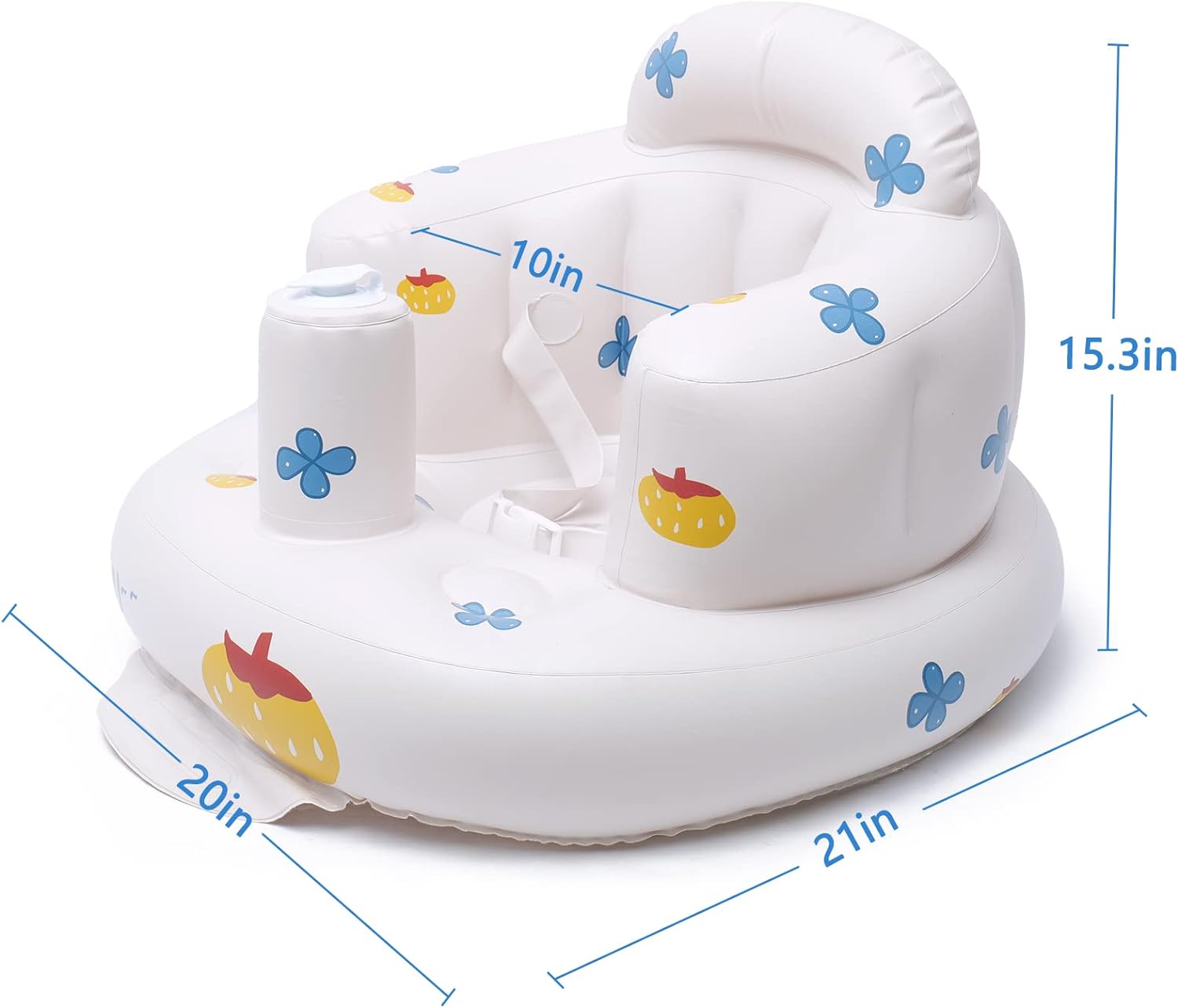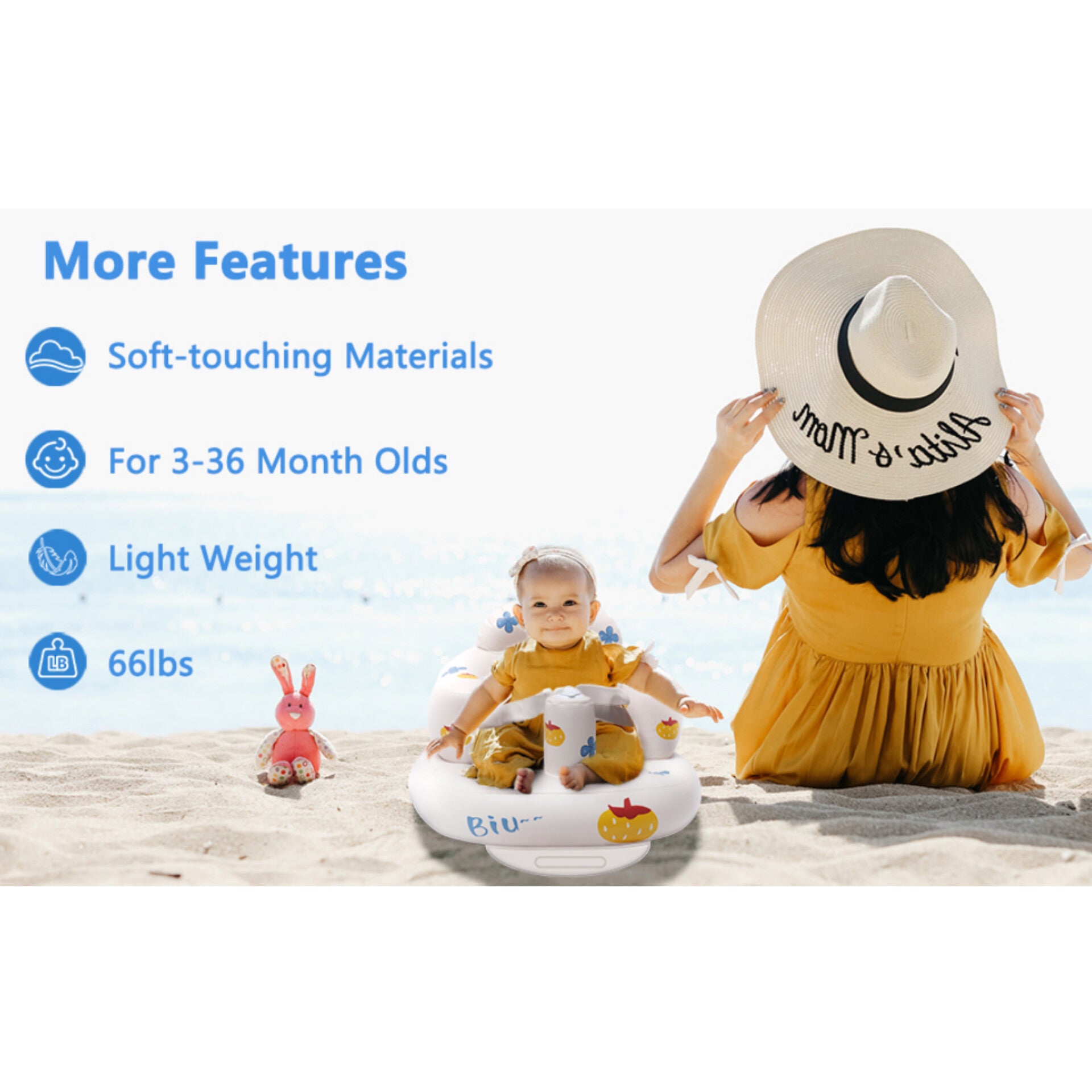 Asiento de seguridad y apoyo: este asiento inflable para bebé está diseñado para proporcionar apoyo a tu bebé mientras aprende a sentarse. Tiene un arnés de dos puntos y una parte trasera de bolsas de aire en forma de columna alta que proporcionan una mejor protección y apoyo para la columna vertebral del bebé. La silla también tiene un diseño de centro de gravedad bajo, lo que ayuda a evitar la inclinación de la espalda y el vuelco. Su bebé puede apoyarse cómodamente contra el respaldo del asiento mientras está sentado, jugando o comiendo.