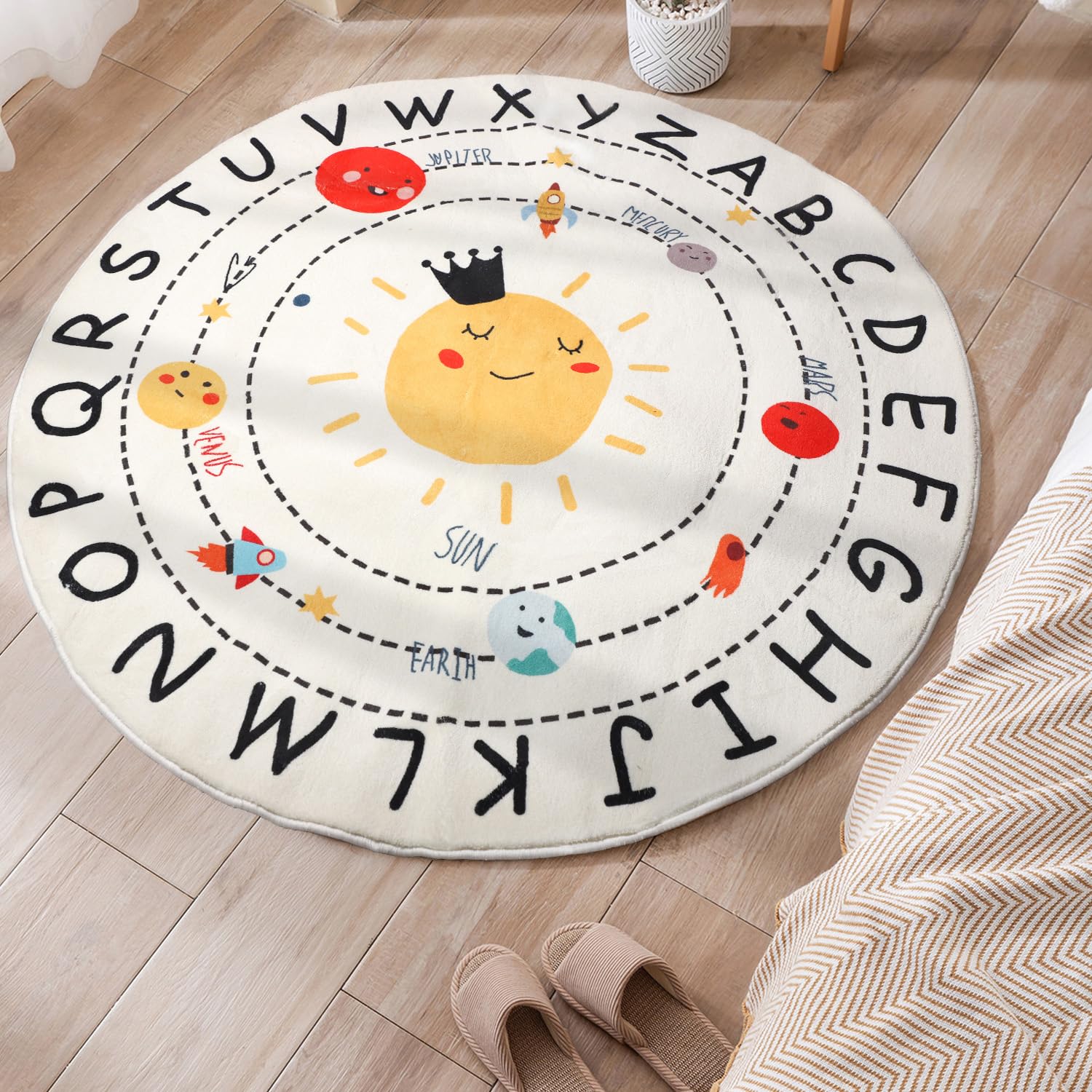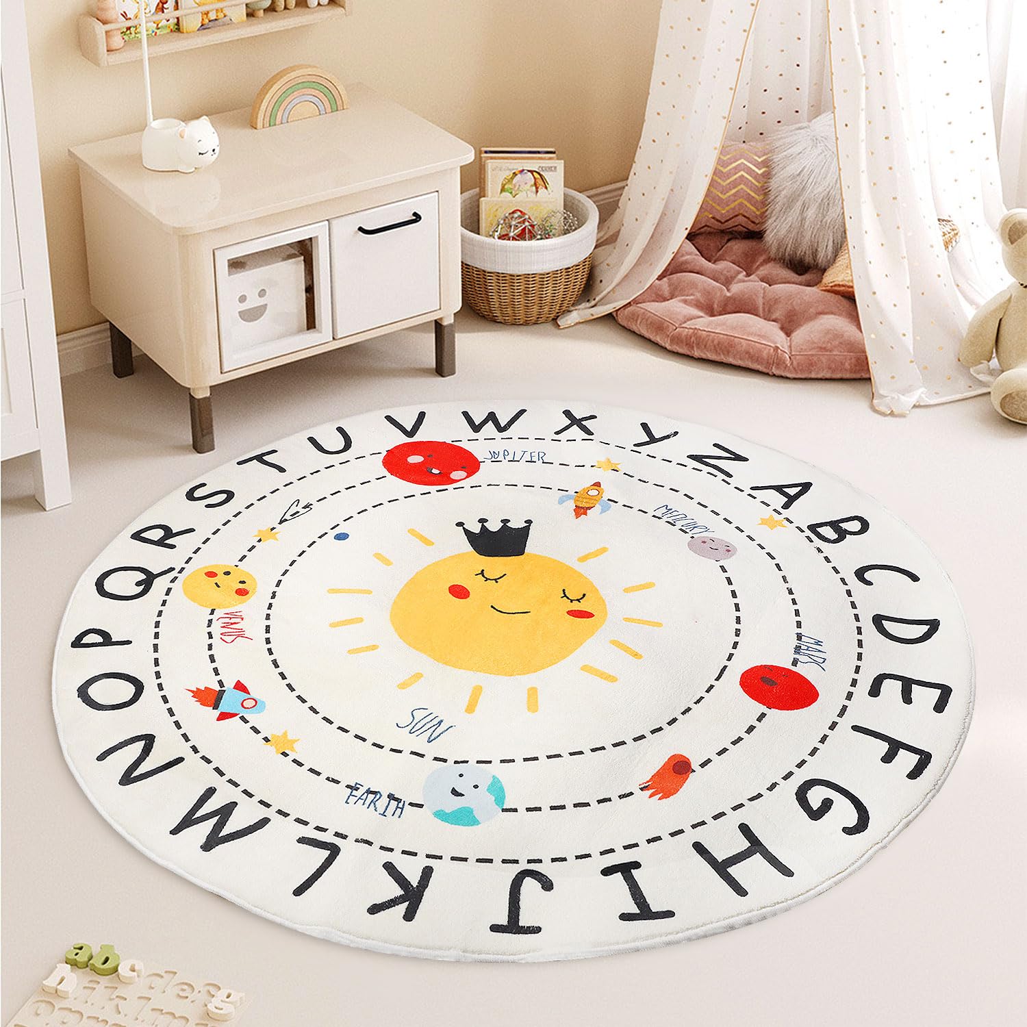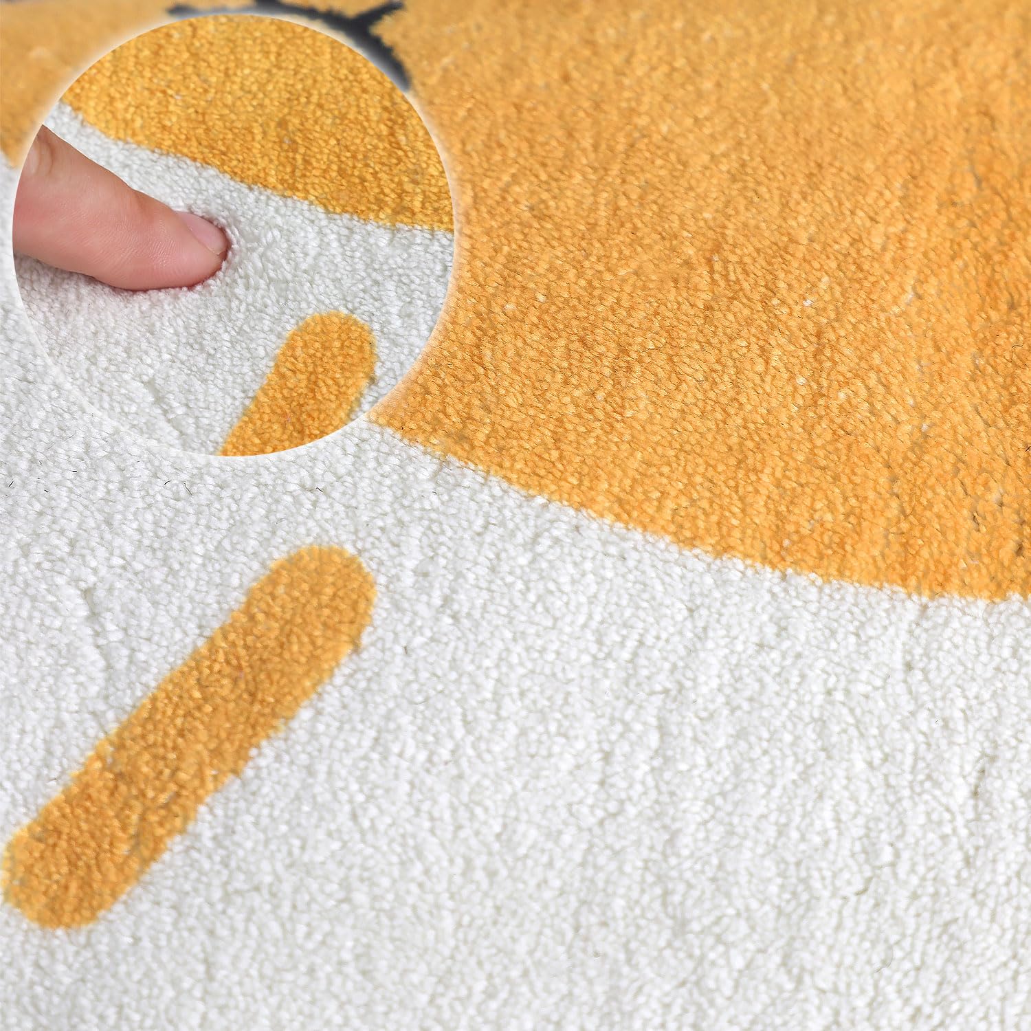 Material: 32 pulgadas de diámetro y 0.5 pulgadas de grosor, algodón y poliéster, lana de imitación, la mayor característica de este material es su tacto increíblemente suave, especialmente cuando caminas sobre él.