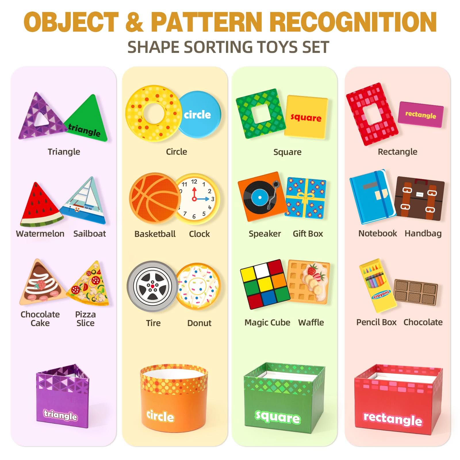 - Clasificadores de formas para niños pequeños: nuestros juguetes clasificadores de formas mejorados vienen con 4 cajas de clasificación diferentes, incluyendo círculo, triángulo, cuadrado y rectángulo, cada uno unido con 6 objetos diferentes en nuestra vida diaria. Los bloques de madera de 28 piezas de Totoally permiten a los niños sumergirse en el mundo del clasificador de formas