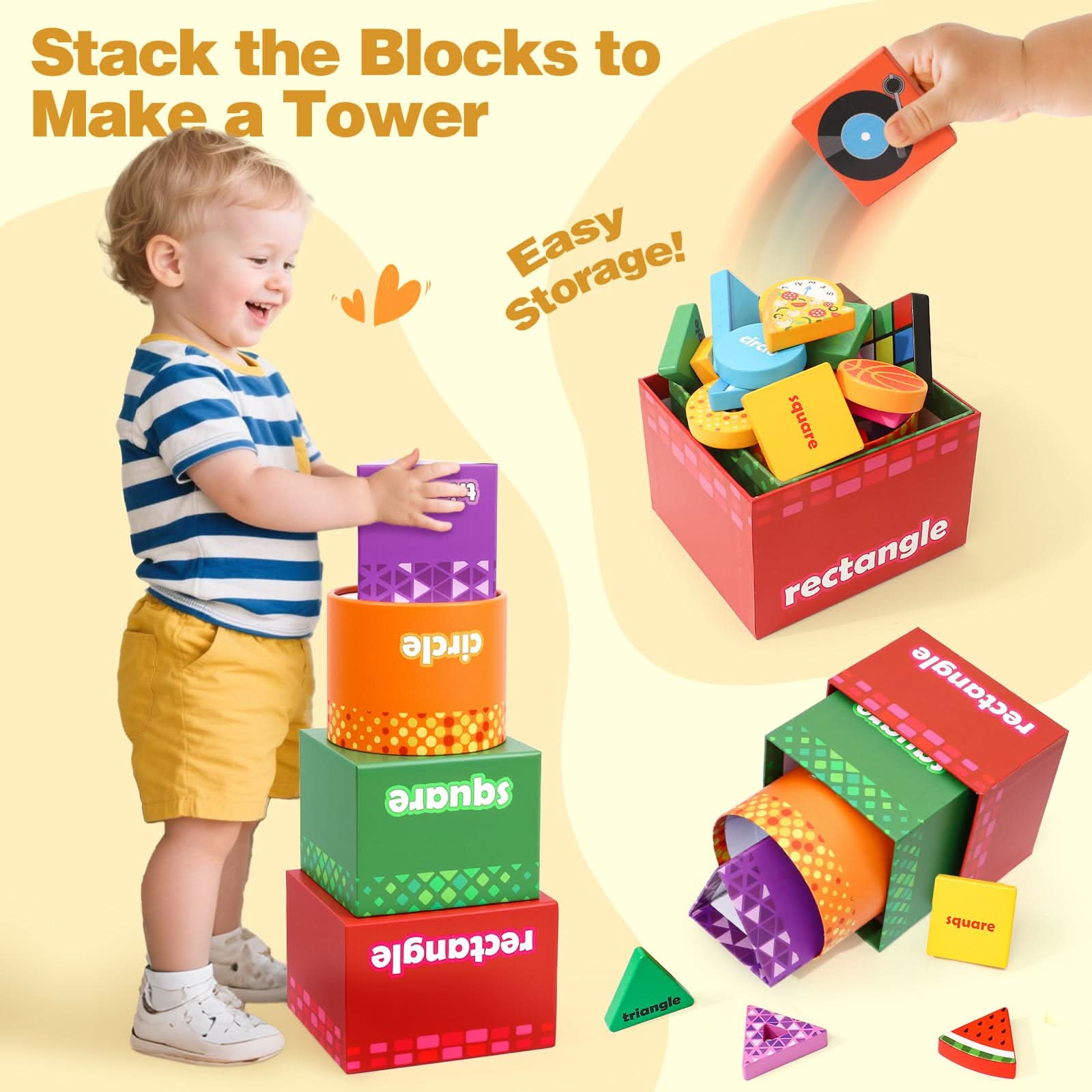 - Juguetes de clasificación multifuncionales: los niños pueden reconocer una variedad de formas en el mundo que los rodea, y cada forma corresponde inteligentemente a objetos cotidianos familiares, como sandía para triángulo, reloj por círculo, chocolate para rectángulo y gofre para cuadrado. También los más pequeños apilan los coloridos bloques de madera y construyen la torre mediante cajas anidables para el doble del valor de juego.