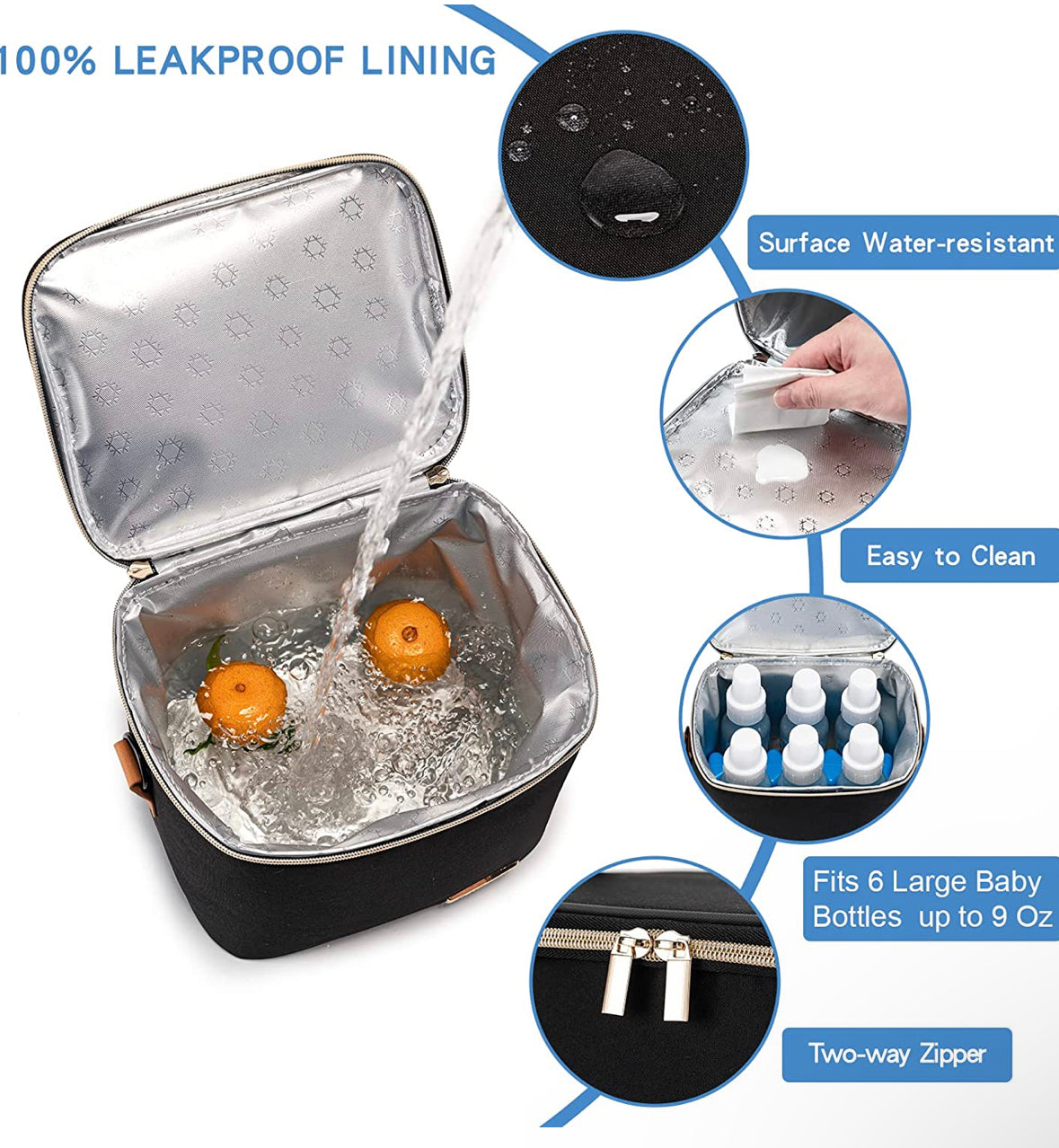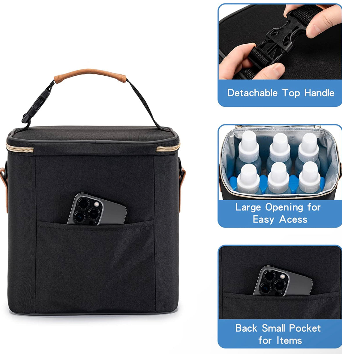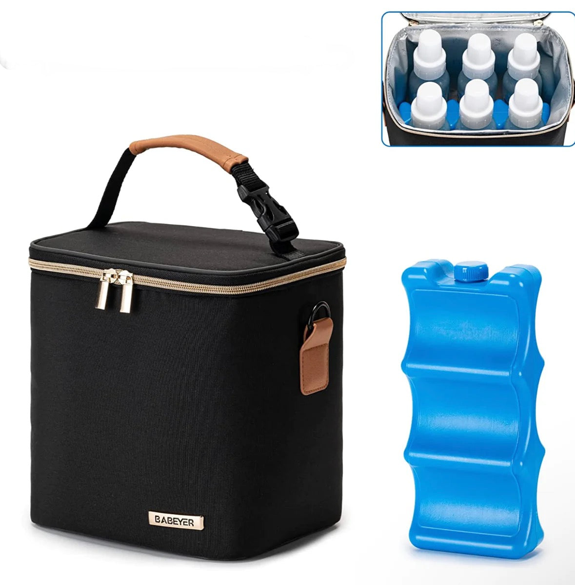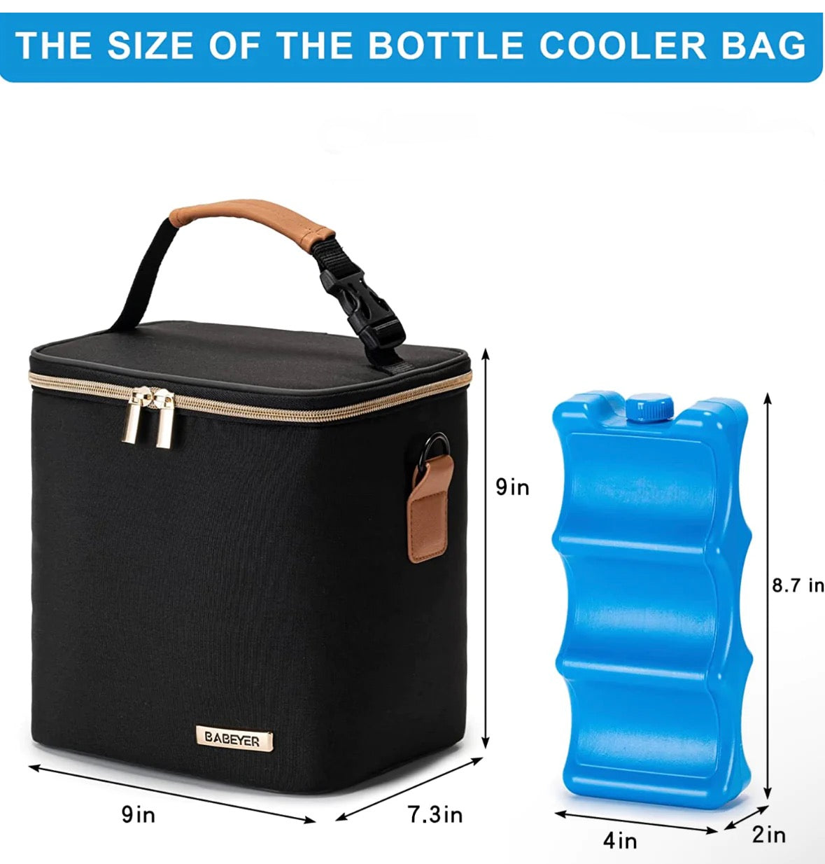 bolsa enfriadora de leche materna viene con un paquete de hielo que puede colocar hasta 6 biberones de hasta 9 onzas. Tamaño de la bolsa para biberón de 9 pulgadas de largo x 7.3 pulgadas de ancho x 9 pulgadas de alto
