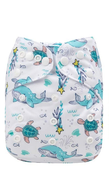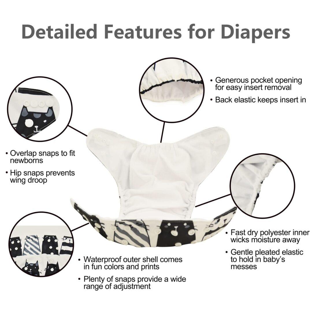 Hecho de poliester. Todo en un tamaño. De 0 a 2 años. Doble filas de broches ajustados.Medio ambiente saludable. Resistente al agua.Material fuerte absorbente con transpirabilidad. Refuerzos en la pierna contra fugas