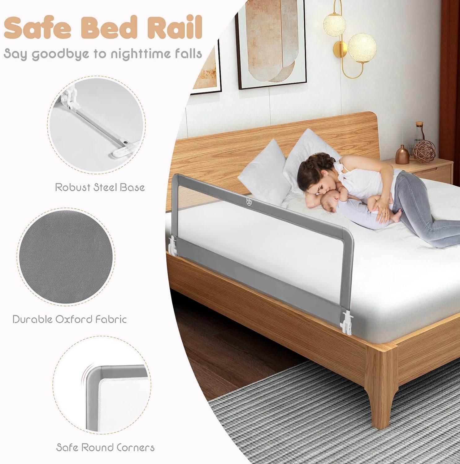 [Universal para cualquier tipo de cama]: esta barandilla para cama de bebé se adapta a todos los tamaños de cama, como camas individuales para niños, camas tamaño queen, camas matrimoniales y camas king. Funciona con cualquier tipo de cama que tenga lamas, somieres o base de madera. Puede optar por utilizar un cinturón para asegurarlo.