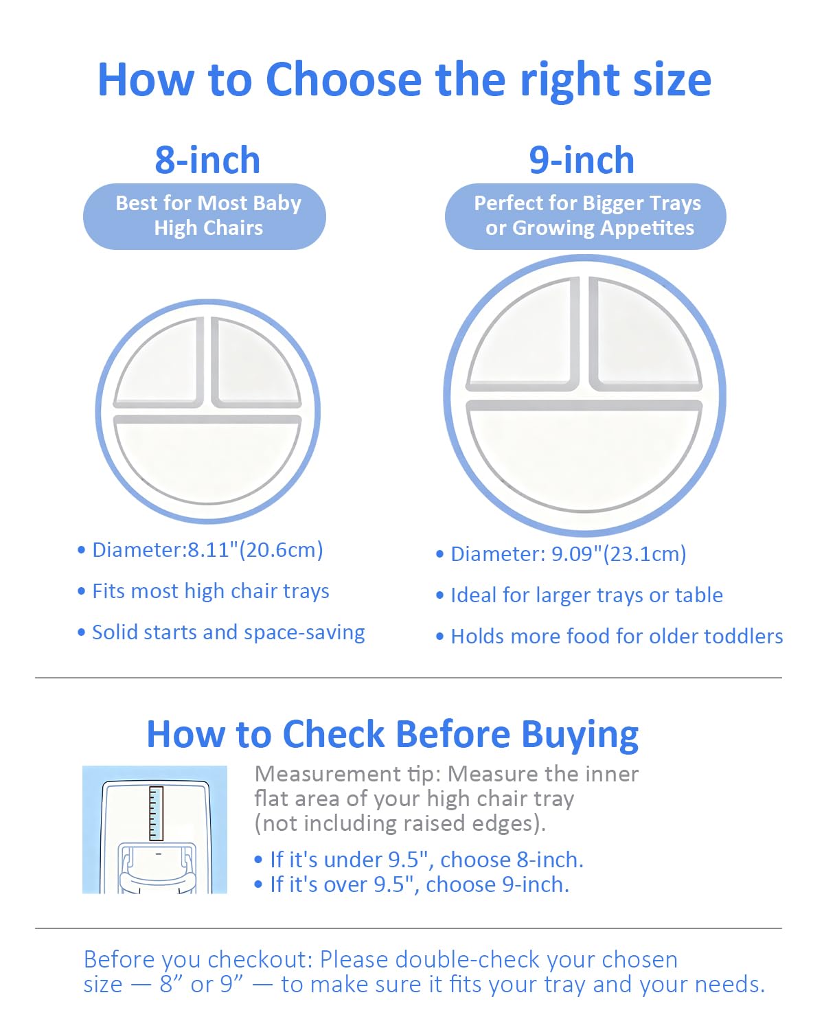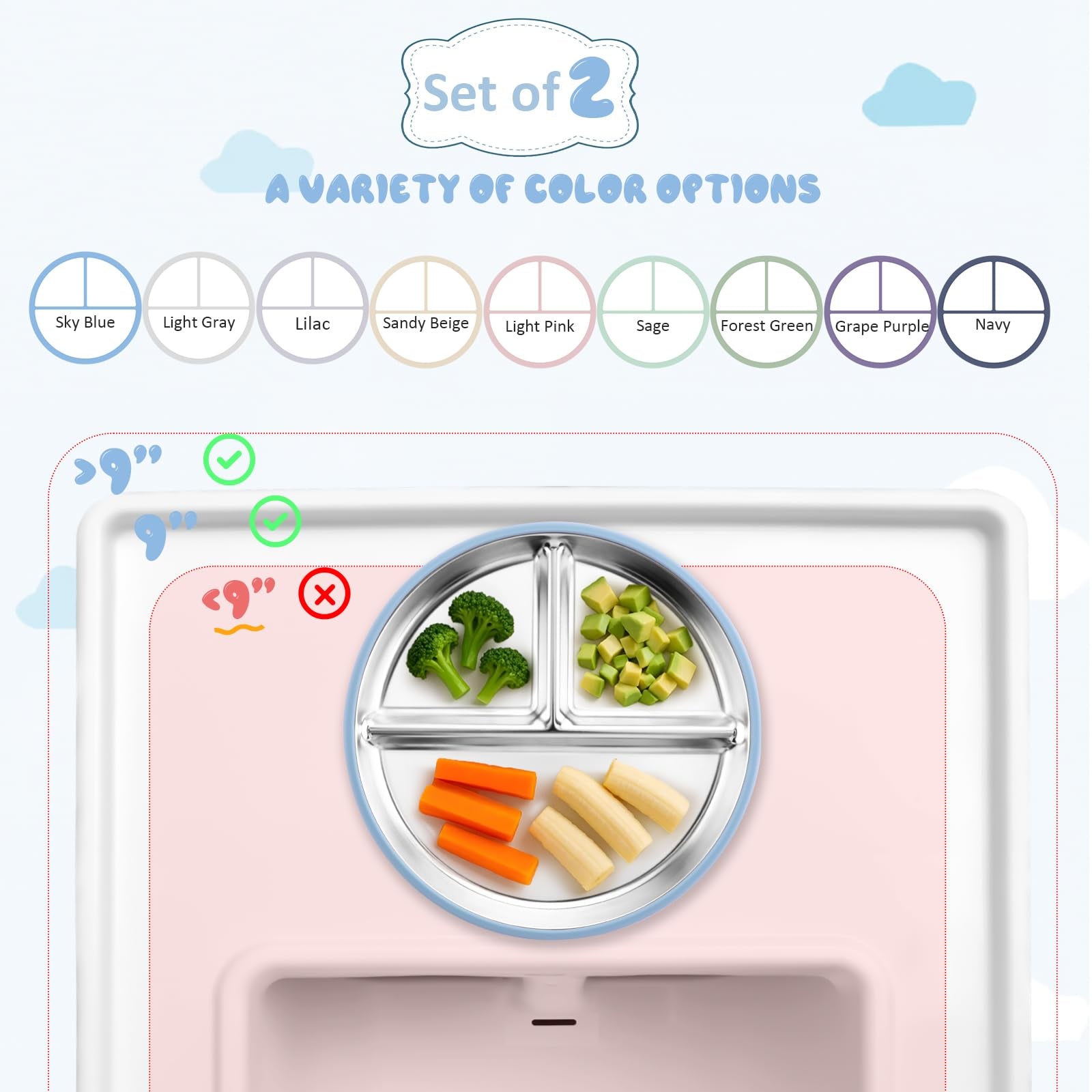 - Antes de comprar: diseñado para un uso sin complicaciones. La base de succión se adhiere de forma segura a superficies limpias y planas (como bandejas para tronas, mesas de vidrio o pulidas) y sillas altas con bandeja de al menos 9 pulgadas de ancho interior. Nota: El plato de 9 pulgadas es intencionalmente espacioso para comidas equilibradas. Mide tu bandeja antes de comprar. Evite las mesas de madera áspera para un agarre óptimo