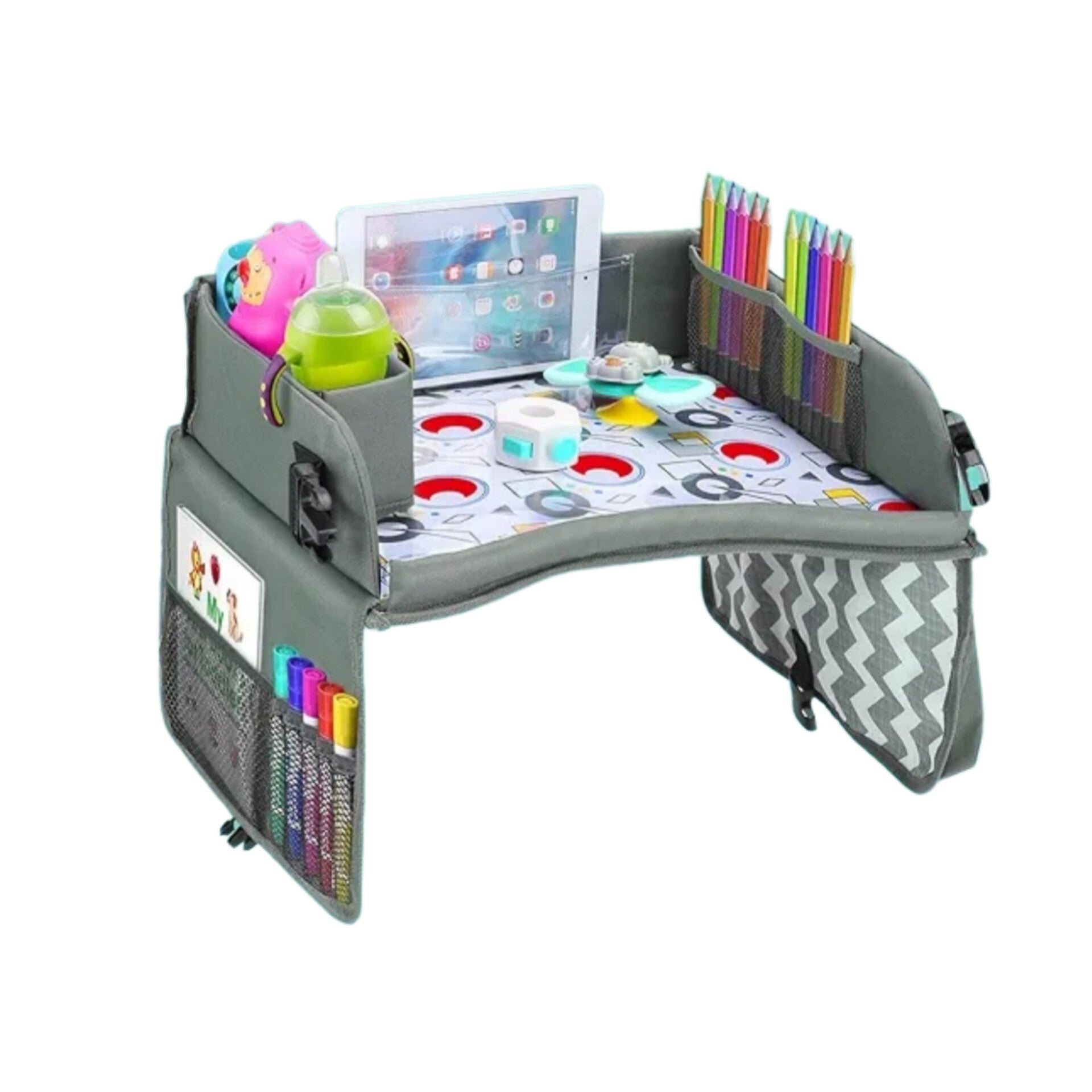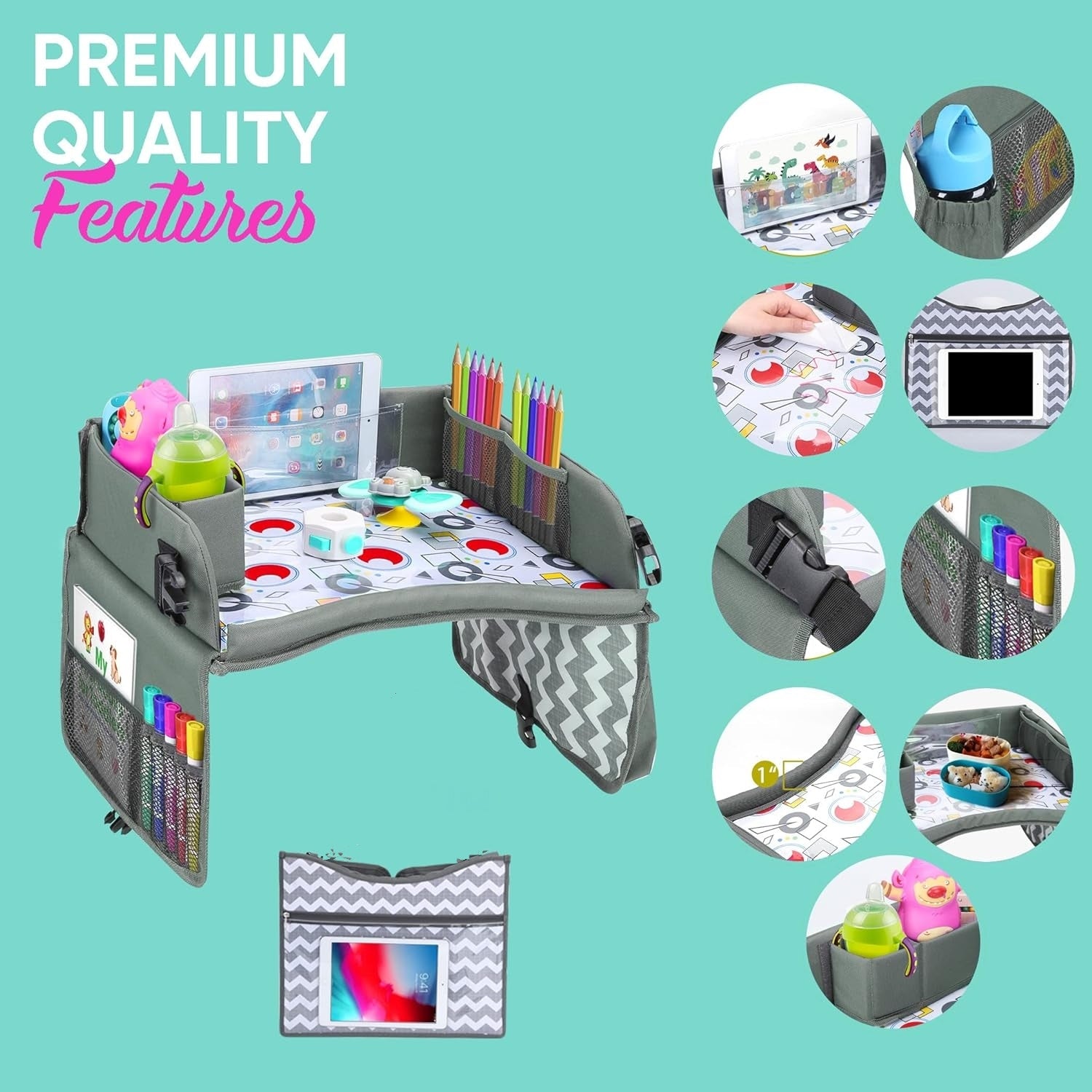 Bandeja de asiento de coche de diseño único y resistente: hecha pensando en los niños: nuestras bandejas de viaje portátiles de alta calidad para niños son el accesorio perfecto para mantener al niño comprometido y silencioso. Esta bandeja de asiento de coche para niños es de 16.5 x 13.5 pulgadas con paredes laterales acolchadas reforzadas de 4 pulgadas para evitar que las cosas se caigan. Hebillas grandes para mantener la bandeja de regazo del coche en su lugar. Base inferior para mayor estabilidad, ya sea que lo estés utilizando como bandeja de aperitivos/alimentos, para colorear o para juguetes.