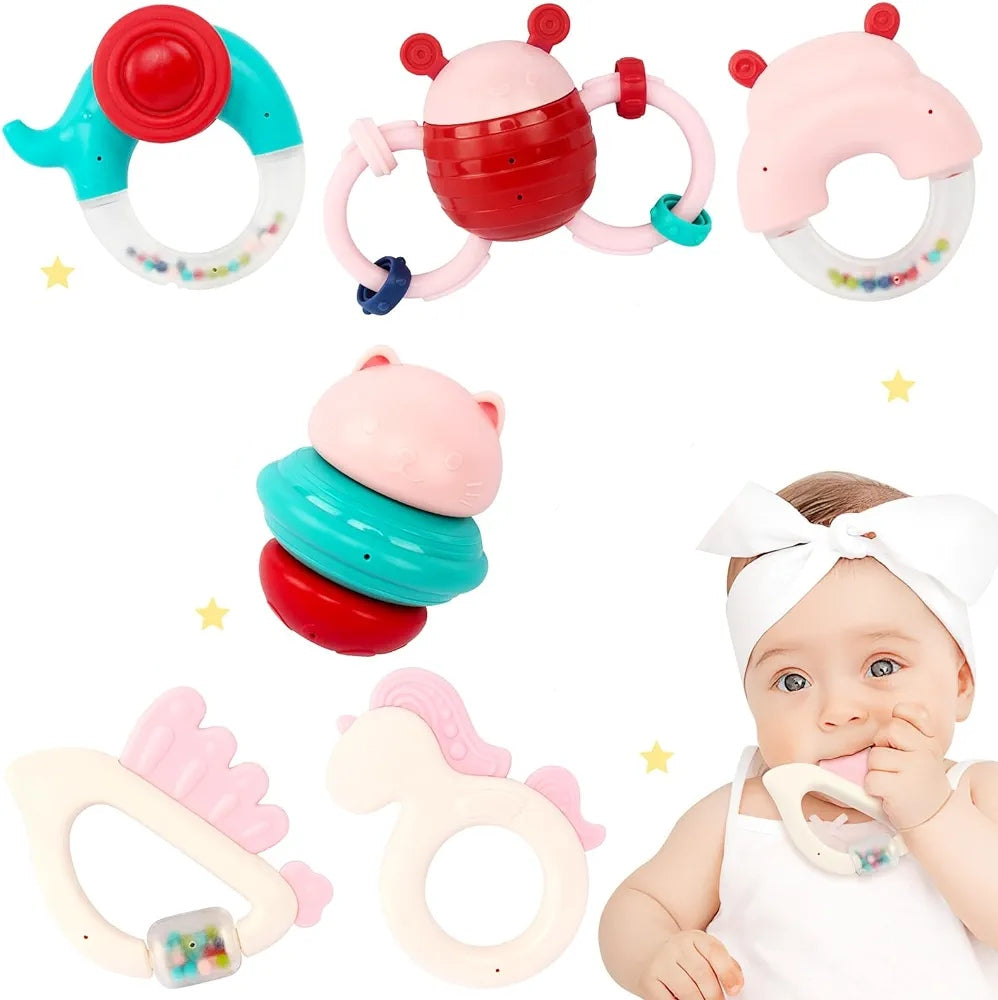 - [Satisface las necesidades de la dentición]: la dentición puede plantear desafíos para los bebés, generalmente comienza alrededor de los 4, 5 y 6 meses de edad. Estos juguetes sonajero mordedor cuentan con una variedad de superficies texturizadas con múltiples puntos de mordida, que brindan un suave masaje en las encías para aliviar las molestias y el dolor asociados con la dentición, mientras calman las emociones de su bebé.