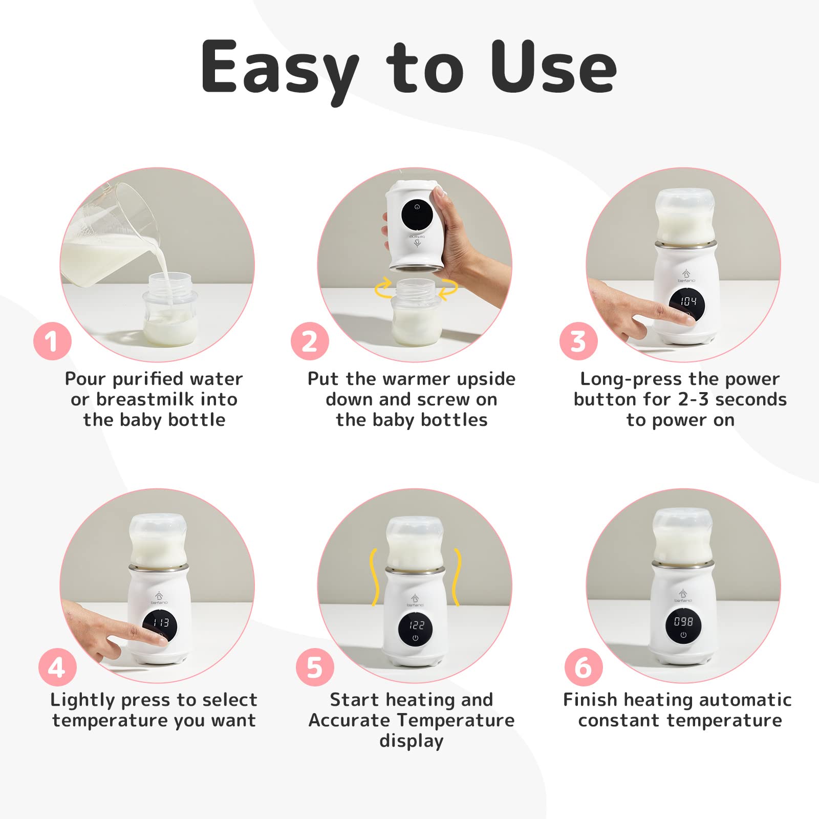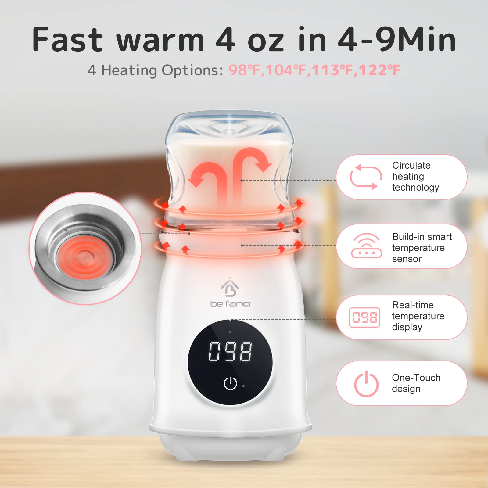 【4 opciones de calefacción y control táctil】4 opciones de calefacción incluyen 98 °F, 104 °F, 113 °F y 122 °F. Calentador de biberones de viaje Befano con un sensor de temperatura integrado para calentar mucho más preciso que calentar en el agua. Pantalla de temperatura en tiempo real para controlar y comprobar la temperatura. 98 °F es la temperatura ideal para la lactancia, y se recomienda 104 °F para preparar leche en polvo. Dos modos de táctil: pulsación corta y pulsación larga, que es cómodo y fácil de usar