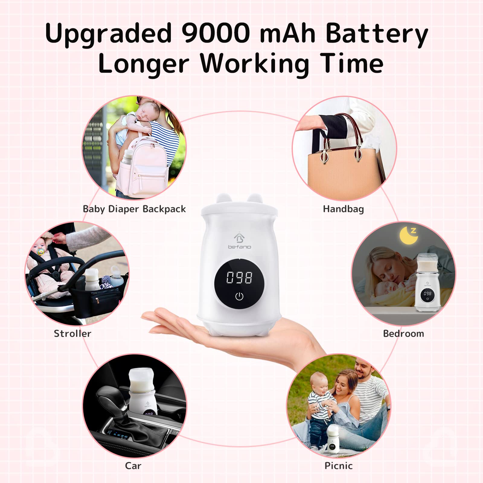 Capacidad de la batería de 9000 mA: debido al calentador de biberones Befano con capacidad de batería de 9000 mA, el calentador de biberones para leche materna tiene un tiempo de funcionamiento más largo, lo que resuelve el problema de alimentación en viajes. Este calentador de biberones sobre la marcha se puede utilizar no solo en interiores, sino también al aire libre, ideal para coche y viajes. En lugar de calentar en el agua, el agua, el agua, el calentador directamente el biberón, más fácil de calentar a un biberón, para un biberón específico. temperatura. Cuidados bien del sistema digestivo de tu bebé