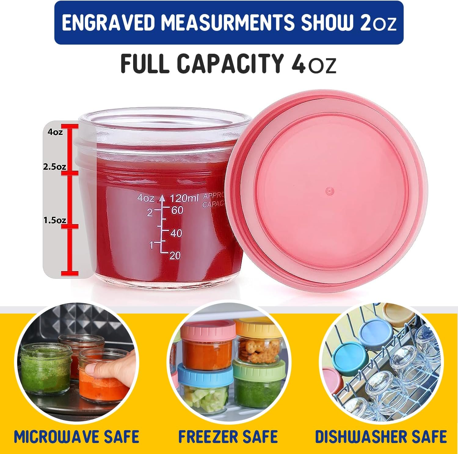 12 paquetes en total, cada uno con 4 onzas. Suficiente para las preparaciones diarias de comidas para bebés. Además, se puede llenar de manera fácil y precisa hasta la capacidad requerida gracias a las medidas grabadas. Hay medidas de volumen en el costado para que pueda controlar de cerca el consumo del bebé. Se pueden lavar en el estante superior del lavavajillas, incluidas las tapas