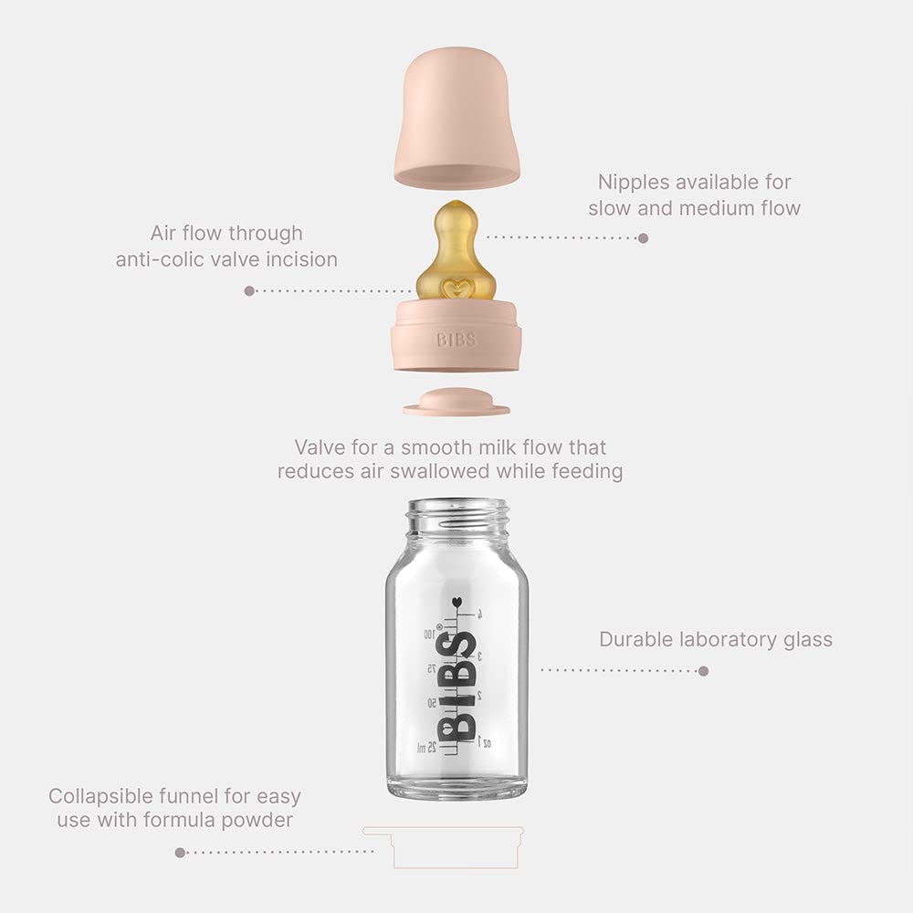 BIBS Biberón de vidrio para bebé. Anticólico. Pezón redondo de látex de goma natural. Apoya la lactancia materna, juego completo - 7.6 fl oz, rubor