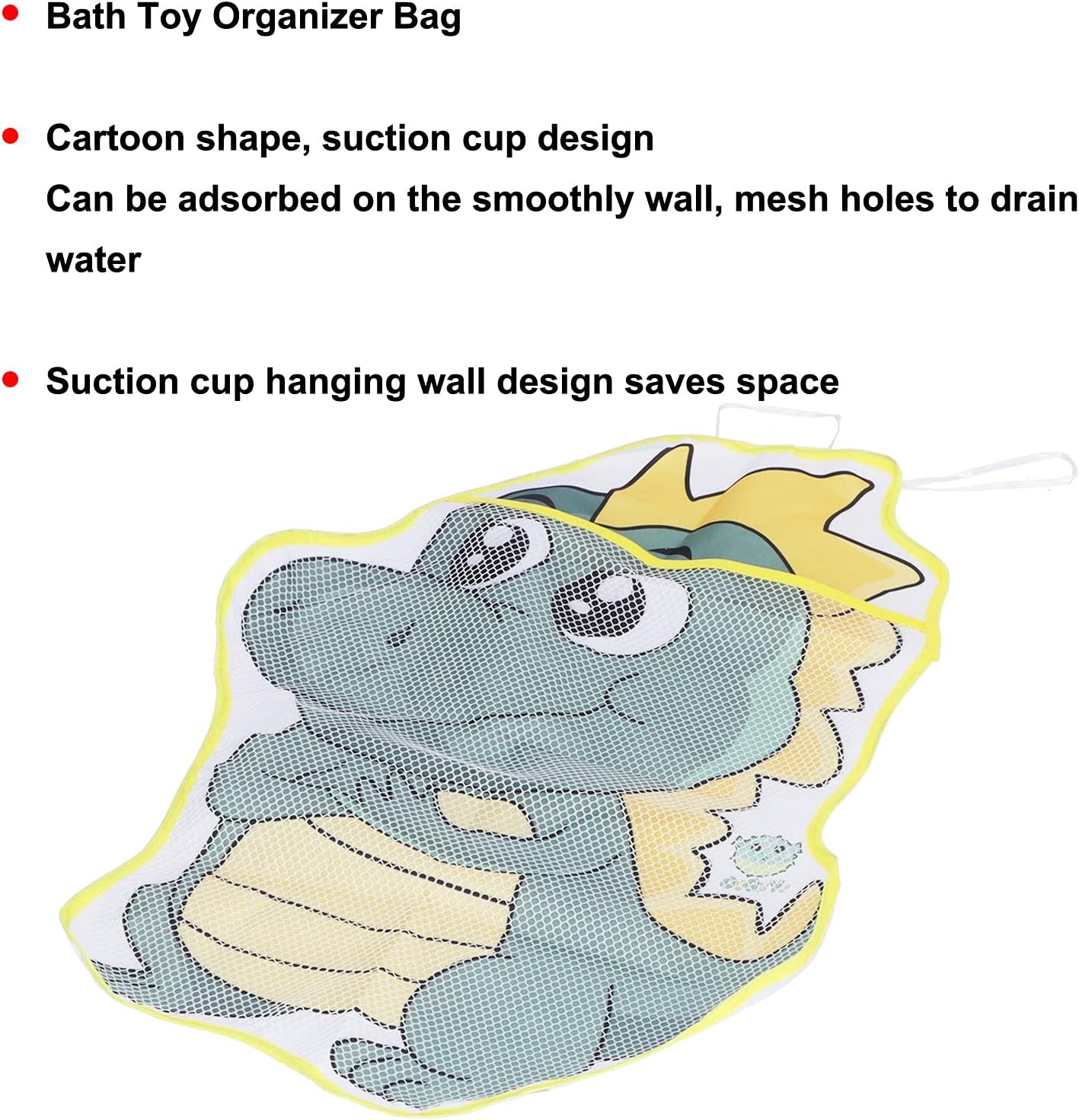 【Ventosa potente】 Puede instalar fácilmente la bolsa de ducha de malla en una posición conveniente utilizando una ventosa potente y asegurarse de que los juguetes de su niño no se caigan.