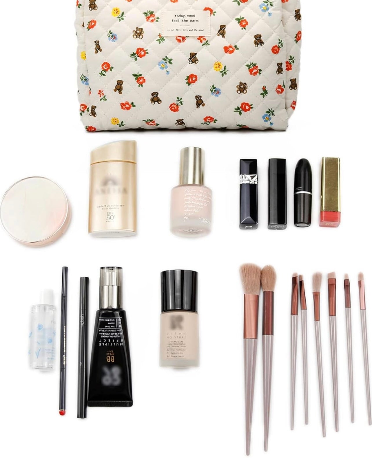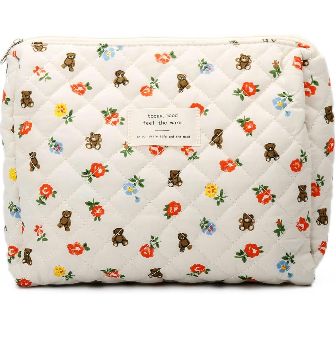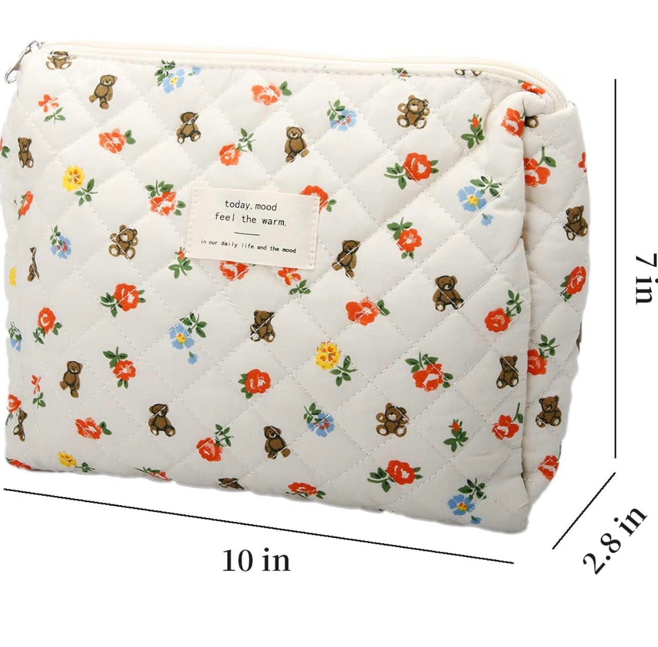 Bolsa de maquillaje de viaje, bolso acolchado para mujer (oso de flores)