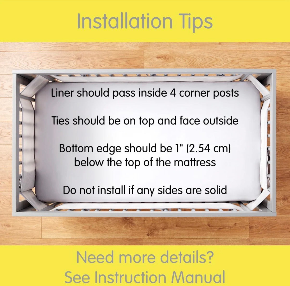 MINI CRIB MATTRESS MUST BE 38" x 24" (97 CM x 61 CM) TO FIT: Install long panel 11" x 127" (28 cm x 323 cm) to cover 4 sides. Fit questions/help? Contact manufacturer. NOTE: NOT FOR FULL-SIZE CRIBS.