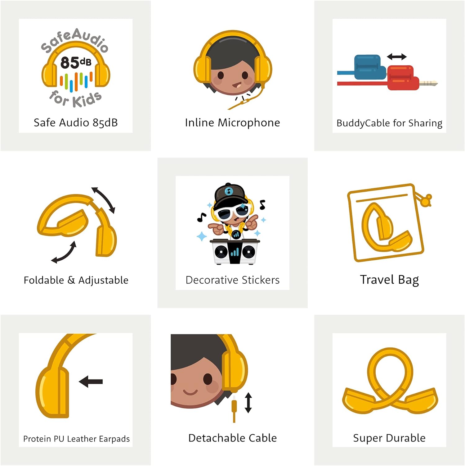 CARACTERÍSTICAS PRINCIPALES: Mayor comodidad y conveniencia para los pequeños exploradores que escuchan mientras viajan. El control de volumen Safe Audio incorporado protege la audición de los niños. Diadema plegable que ahorra espacio. El cable desmontable que evita enganches incluye un micrófono, un botón de llamada/reproducción y nuestro divisor de audio BuddyJack. Ideal para niñas, niños, niños pequeños y todos los niños, recomendado para edades de 3 a 10 años.