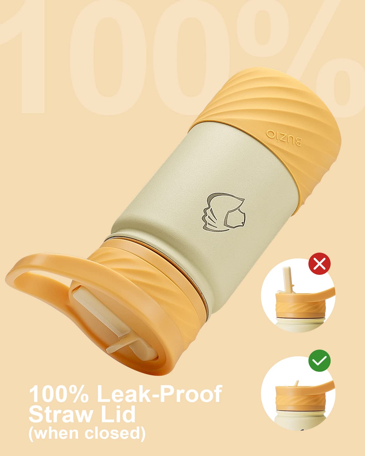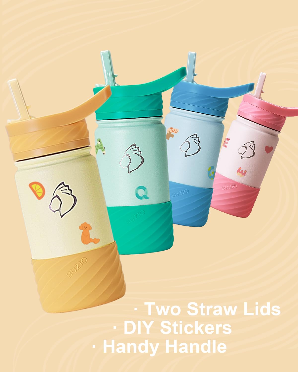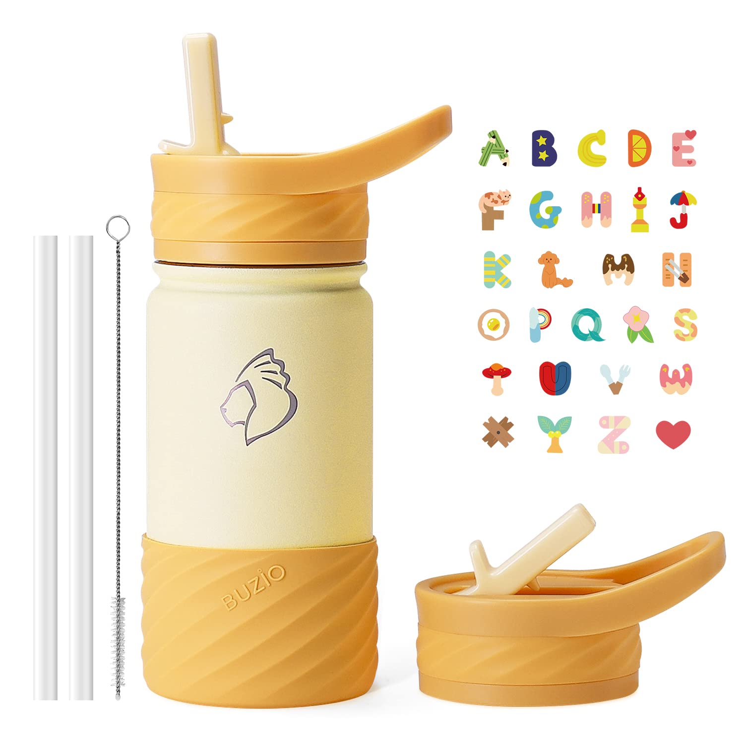 BUZIO Botella de agua para niños pequeños con tapa de popote y funda de silicona