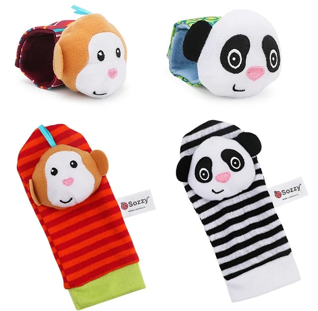 Calcetines y sonajero de muñecas-mono y panda - 4 piezas