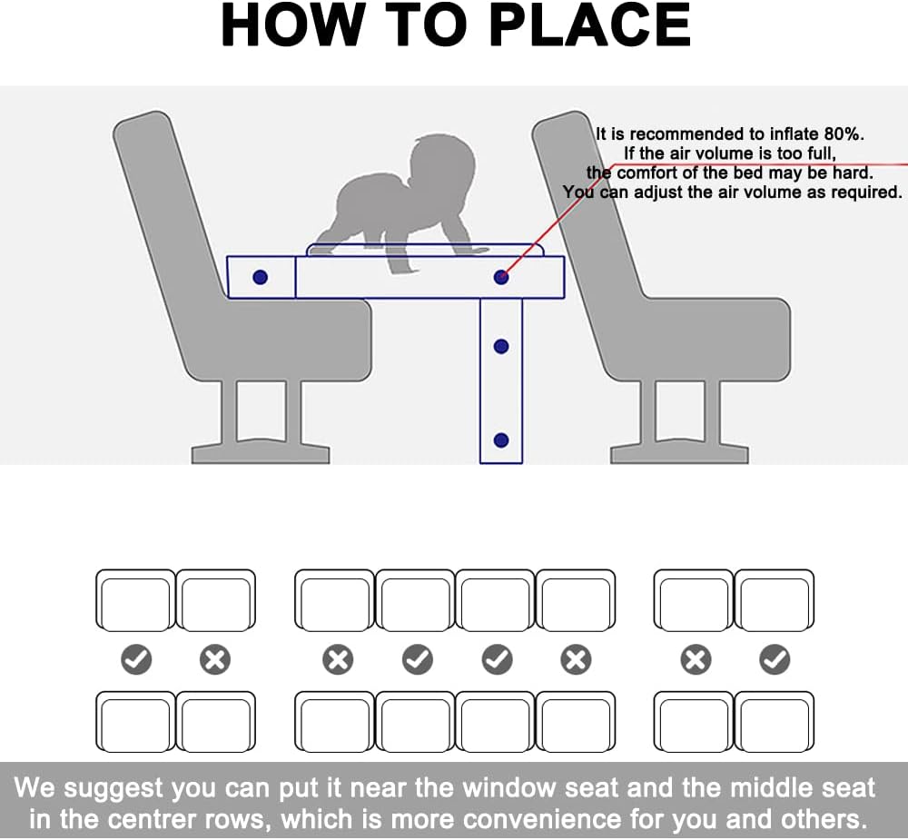 Convierte cualquier asiento de avión en una cómoda cama infantil o cuna de aire para los niños del avión. Te sugerimos que coloques nuestra cama infantil de avión cerca de la ventana o del asiento en el medio de la fila, de modo que incluso si alguien entra y sale en el medio, no se moleste. 【Supervisa siempre a tu hijo cuando la cuna de viaje para bebé esté en uso.】
