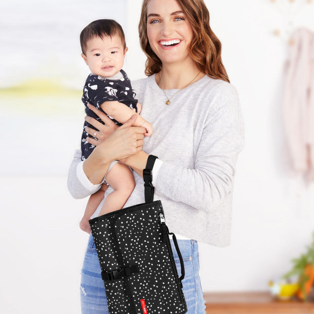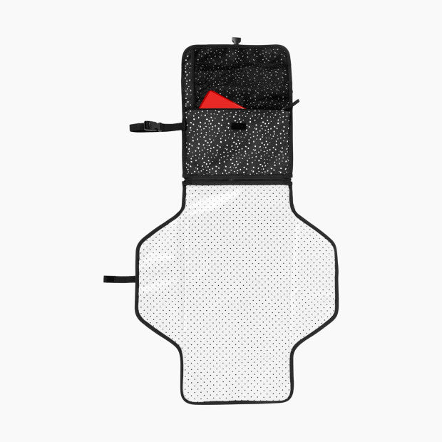 Esto es bastante versátil en lo que respecta al cambio de embragues. Se despliega en un cambiador acolchado con dos solapas laterales para tener más espacio en el piso y una almohada. Un bolsillo de malla cabe en pañales y ungüentos, y un bolsillo frontal con cremallera guarda artículos más pequeños. Se incluye un estuche de toallitas transparente. Un anillo en D de metal está unido al frente. Cabe perfectamente en la mayoría de las bolsas de pañales y se puede llevar en la muñeca o sujetar a un cochecito. El cambiador se puede quitar para poder usar la bolsa para llevar más pañales u otros artículos.