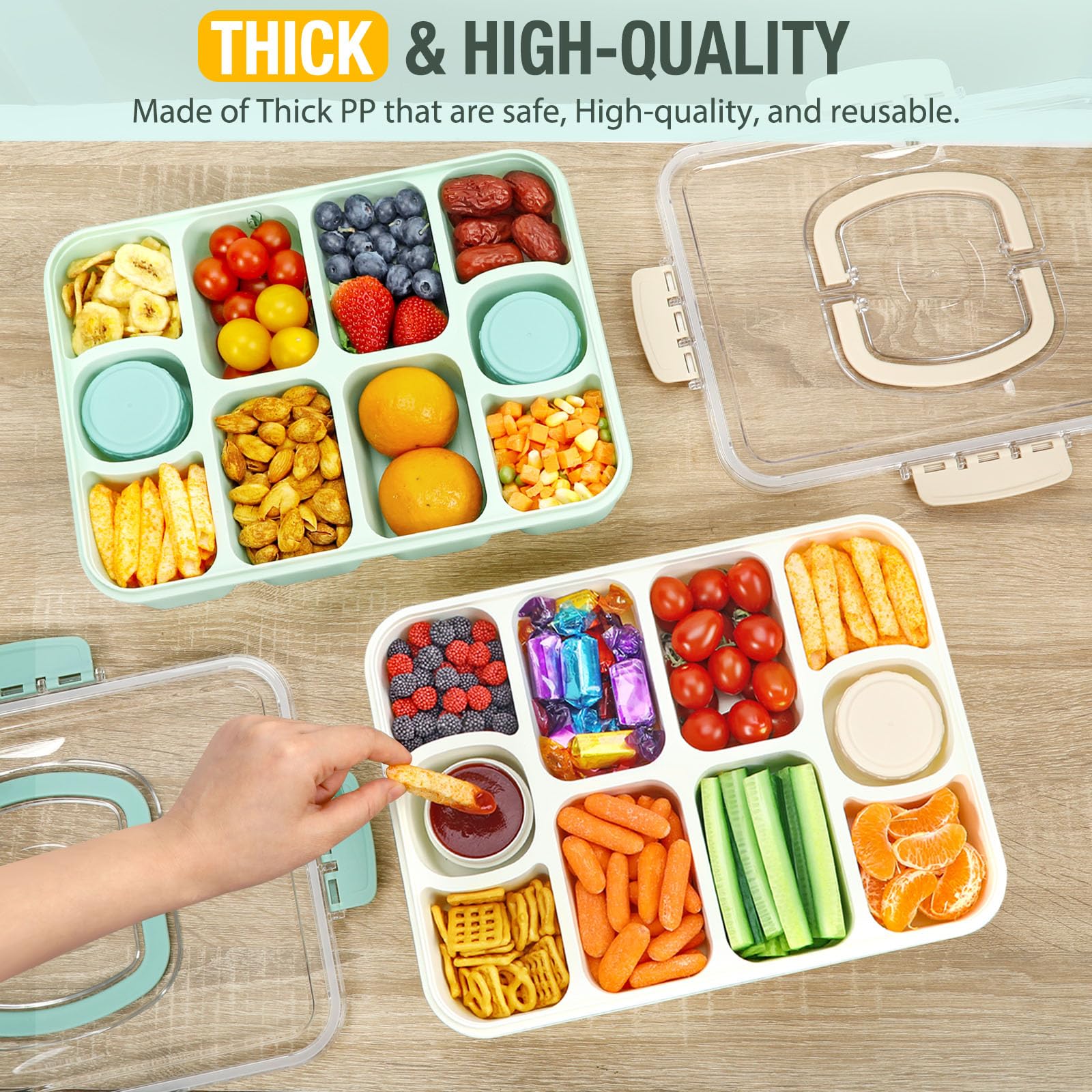 CONTENEDORES EXTRAGRANDES PARA VIAJE: Lleve bocadillos saludables sobre la marcha con este recipiente de caja de aperitivos extragrande, que cuenta con una gran bandeja dividida de 11.5 tazas y 10 compartimentos para fijaciones, 2 recipientes integrados a prueba de fugas para aderezos evitan que sus condimentos y salsas se derramen.