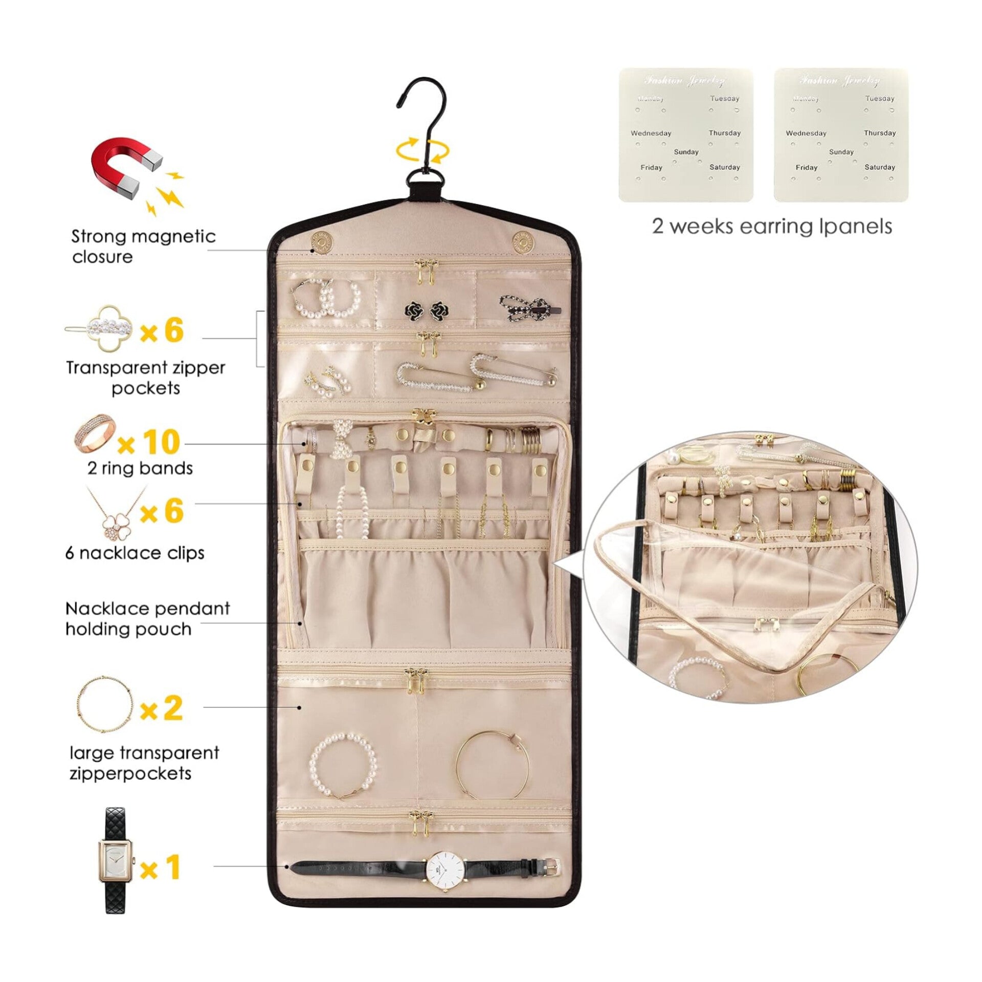 ESTRUCTURA RAZONABLE: Nuestro rollo organizador de joyas de viaje está diseñado con 9 bolsillos visibles de diferentes tamaños, 2 anillos con hebillas y asa, un bolsillo con cremallera con 6 correas con hebilla para collar, evita que el collar se caiga. 1 bolsillo trasero con cremallera y 2 separadores. Paneles para aretes gratis. Diseño único que mantiene todas tus cosas organizadas y evita que tus accesorios, como collares, se enreden y se rayen.