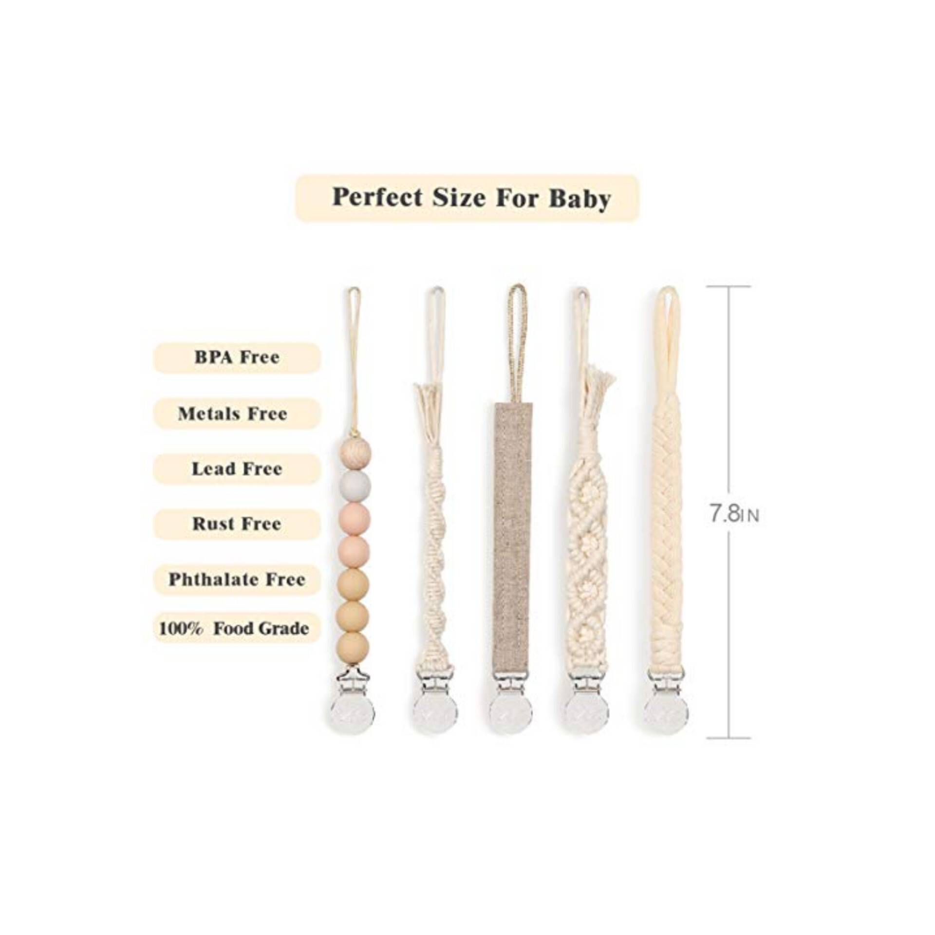 PRODUCTO: cada juego súper lindo incluye 5 clips para chupete. Estos diseños modernos de juego de clips para chupete de bebé se verán geniales en su bebé niño o niña con su moderno aspecto unisex. Estimula el desarrollo visual, motor y sensorial.