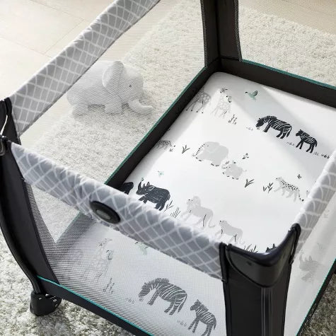 Cada sábana está DISEÑADA PARA AJUSTARSE en un colchón rectangular que mide 25,5” (64,77 cm) de ancho y 37,5” (95,25 cm) de largo. El colchón DEBE tener una profundidad de ½” (1,27 cm) o más. Mida su colchón para asegurarse de que este sea el tamaño de sábana correcto para su corralito. Coloque la sábana sobre el colchón y verifique que se ajuste correctamente ANTES DE USAR.