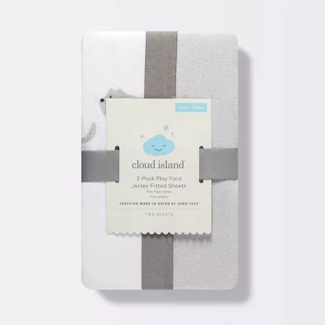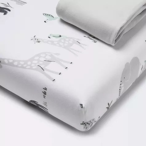 Cloud Island- Juego de 2 sábanas ajustables de Play Yard Jersey , Two by Two Animals y gris sólido