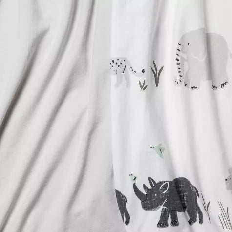 Una sábana en tono gris liso y otra con estampado allover de animales alineados de dos en dos