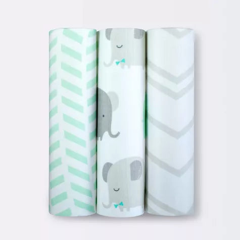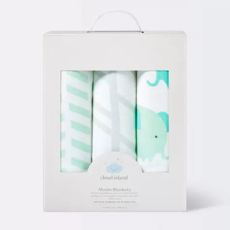 Cloud Island- Paquete de 3 mantas de muselina Elefantes Mint