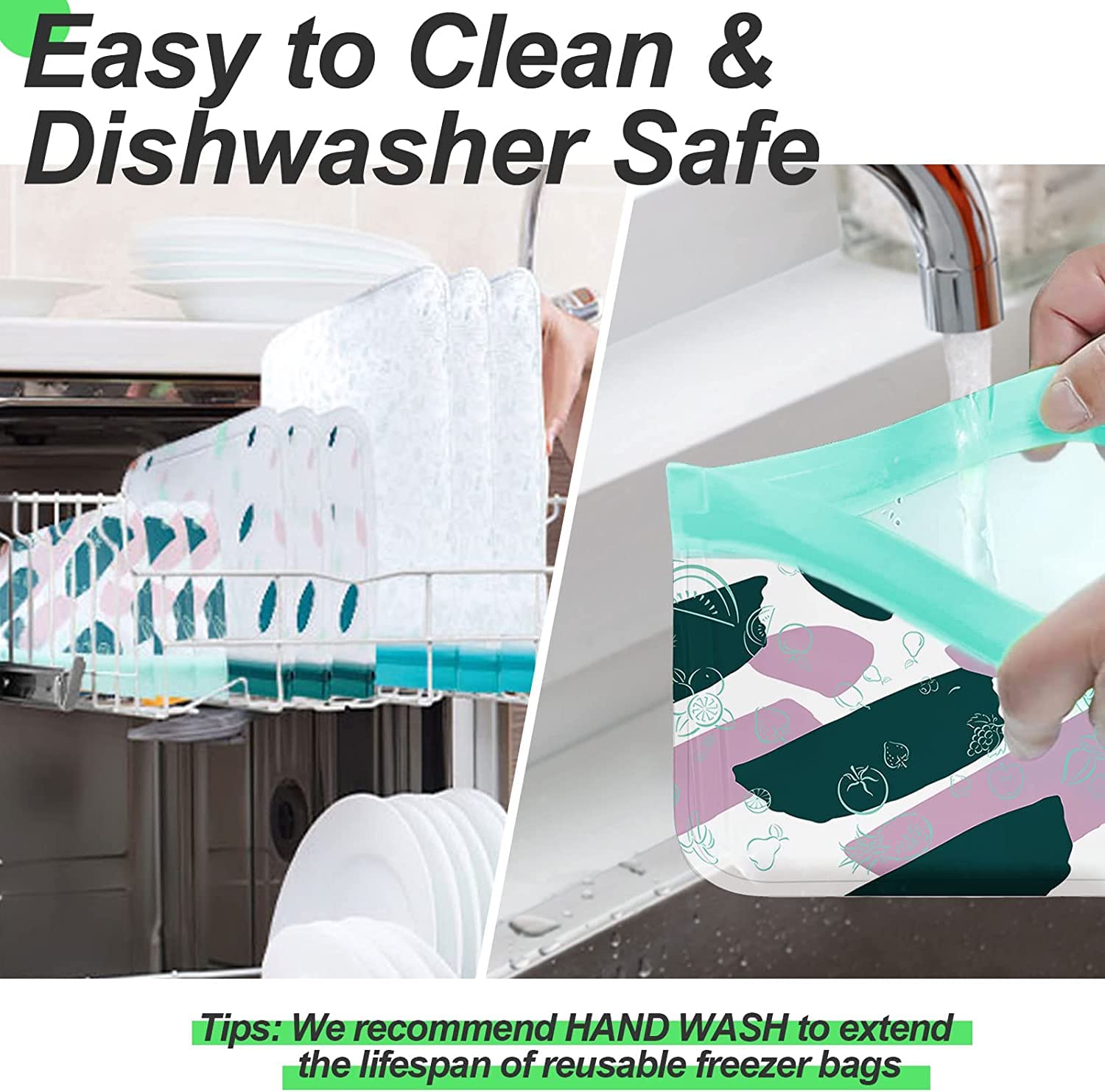 [Limpieza en lavavajillas]: el nuevo material mejorado soporta la limpieza del lavavajillas bolsas de almacenamiento de alimentos reutilizables para prolongar la vida útil de las bolsas reutilizables para congelador. Utiliza un cepillo de botella con jabón y agua tibia o bicarbonato de sodio para eliminar fácilmente cualquier olor, y coloca las bolsas en una taza o en la parte superior de un estante para secar al aire para prolongar la vida útil de tus bolsas de congelador reutilizables.